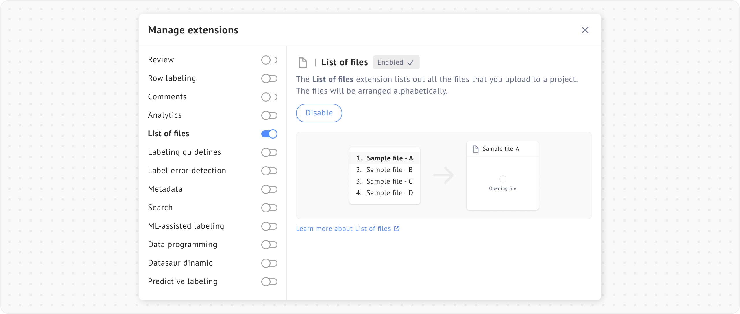 <figure><img src="https://448889121-files.gitbook.io/~/files/v0/b/gitbook-x-prod.appspot.com/o/spaces%2F-MbjY0HseEqu7LtYAt4d%2Fuploads%2Fgit-blob-392d888c3692d59deaae1e1335b729e825de4fcd%2FExtension%20-%20Manage%20extensions%20-%20List%20of%20files.png?alt=media" alt=""><figcaption></figcaption></figure>