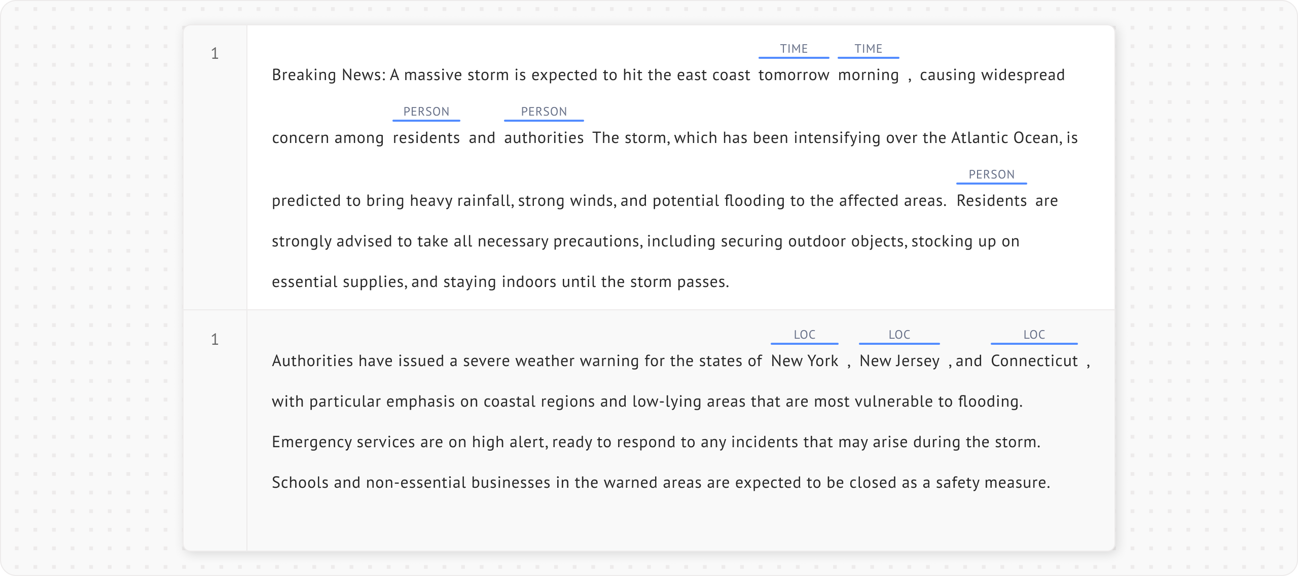 Labeling functions enable the labeling of specific keywords, identifying and extracting relevant information to simplify the data extraction process. For example, within a text, the labeling function can be configured to label only "`LOC"` for terms such as "`New York"`, `"New Jersey"`, and `"Connecticut"`. Also `"Person"` is only labelled for the keywords `"Meterologists"` and `"residences"`. This customization can be achieved by modifying the `DICT_KEYWORDS` function to meet precise requirements.