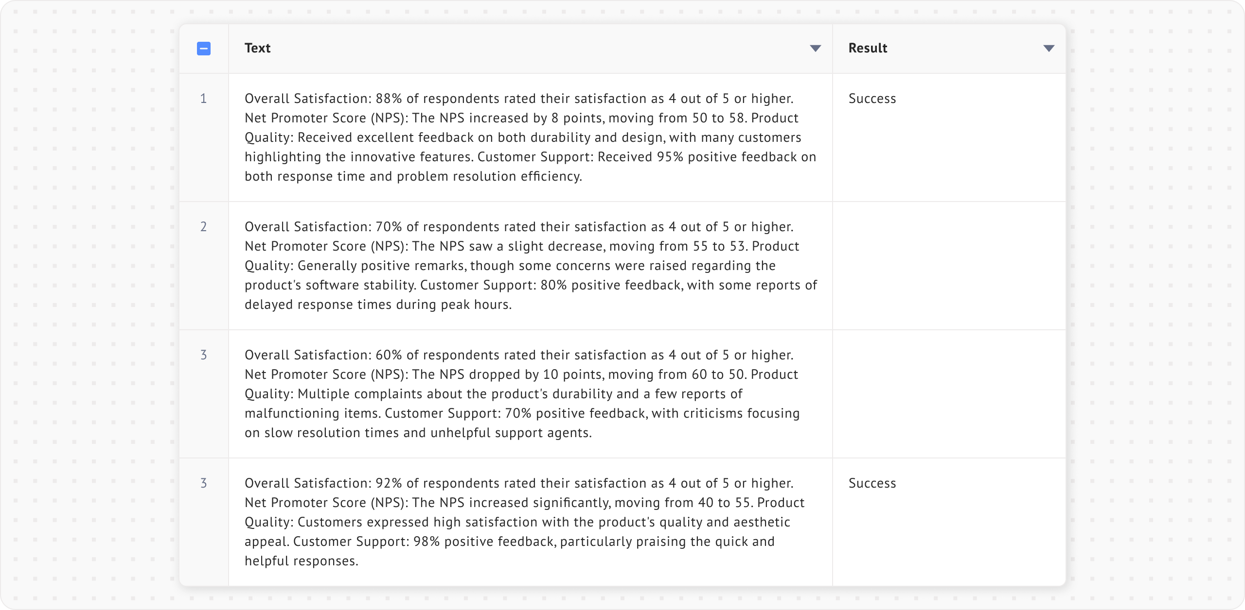* For instance, if a satisfaction score is 4 out of 5 or higher and the NPS has increased, the entry is labeled as "success." Conversely, lower scores or negative feedback result in an "unsuccess" label.