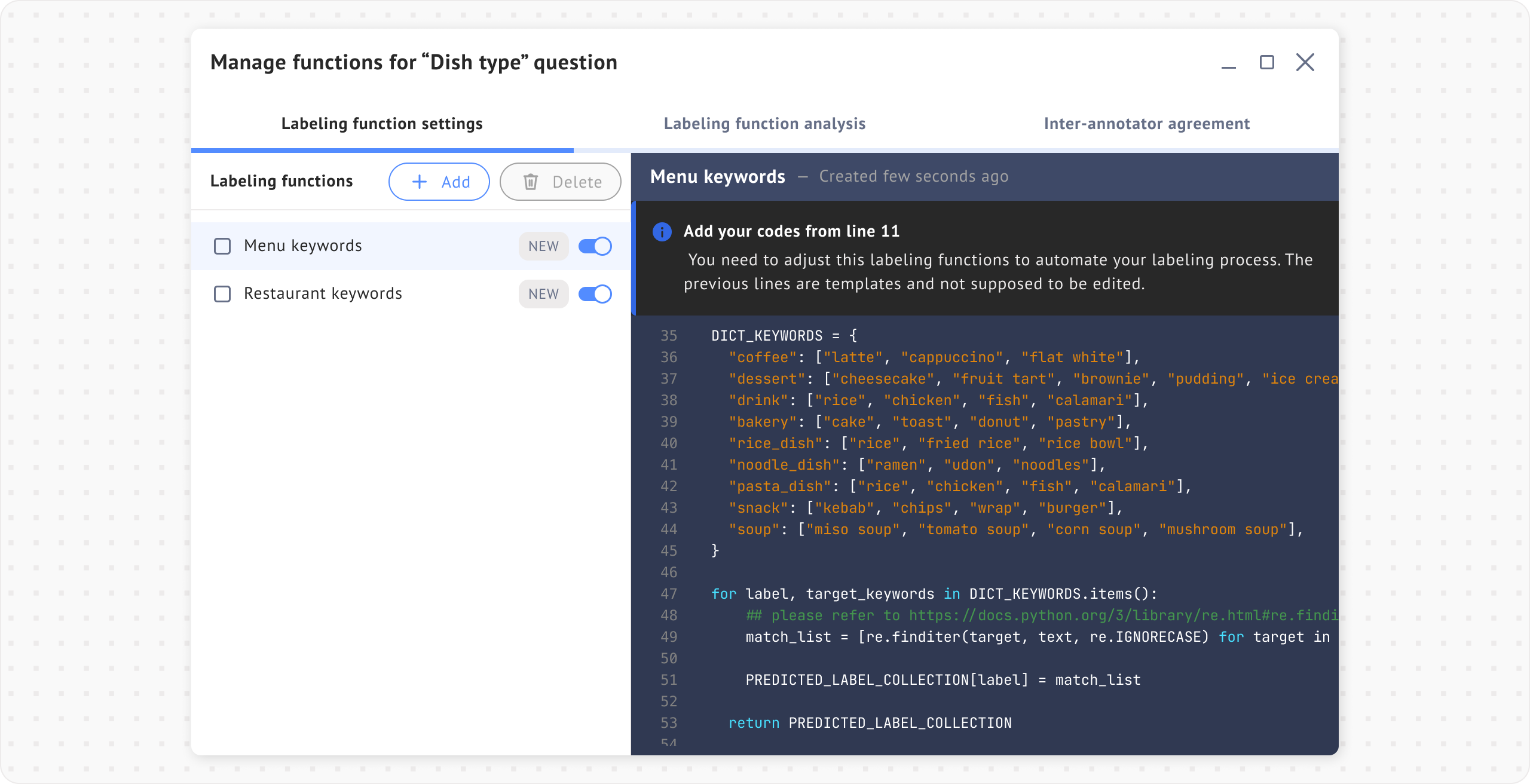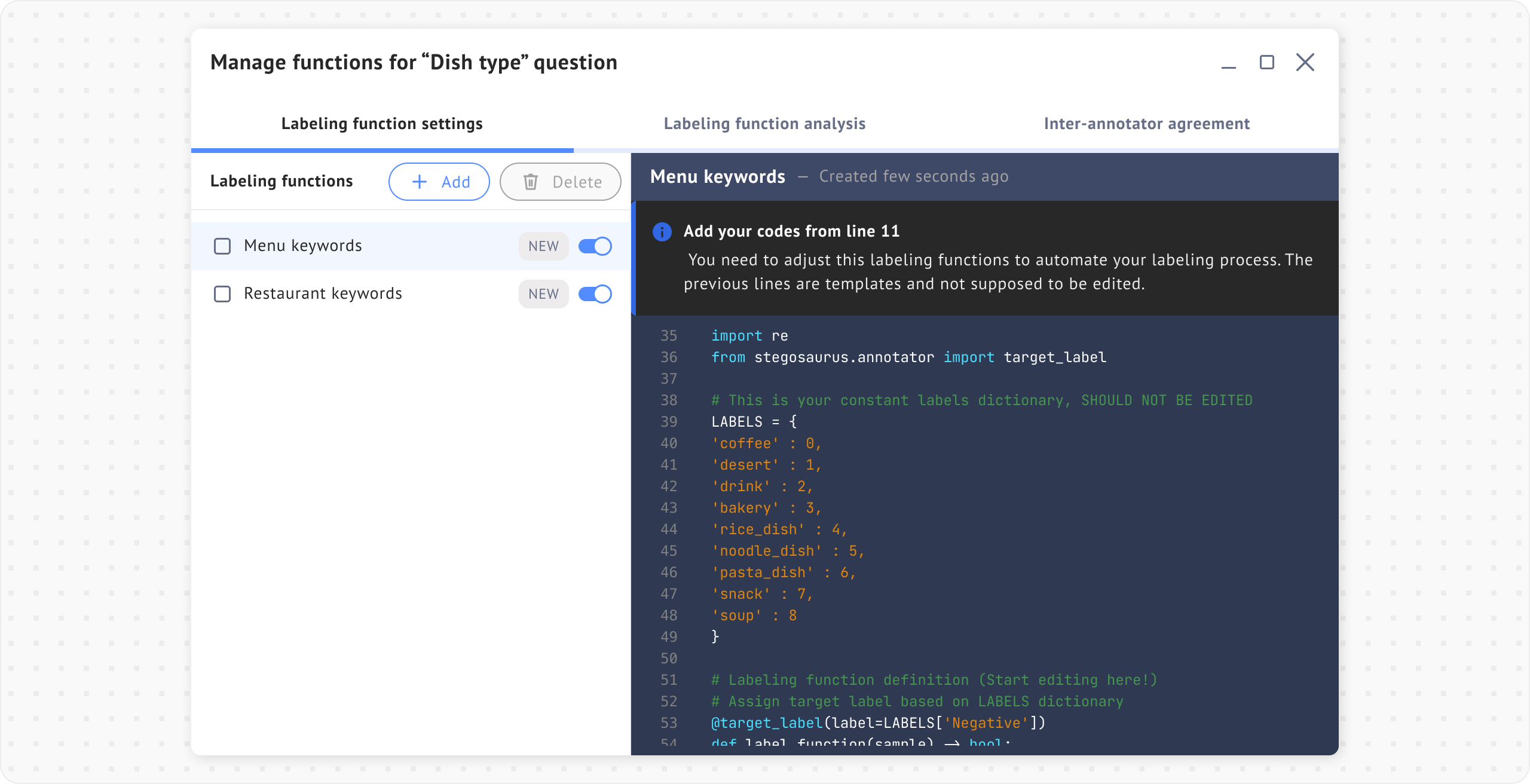 You can start to write your labeling functions using our template and do some experiments with it. Remember, our labeling functions should be written in Python and there are some [libraries](https://datasaurai.gitbook.io/datasaur/advanced/data-programming#supported-libraries) that we support by default.