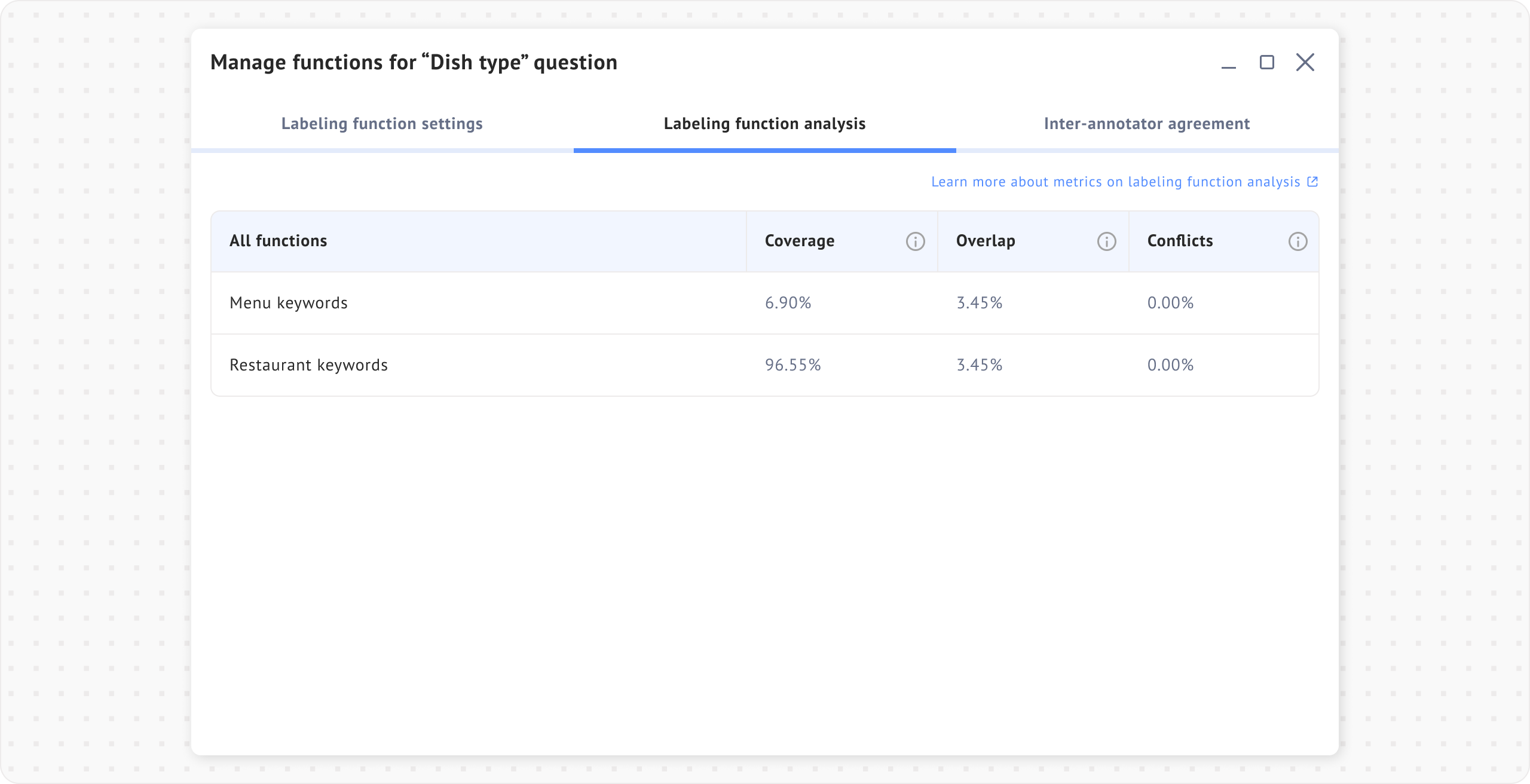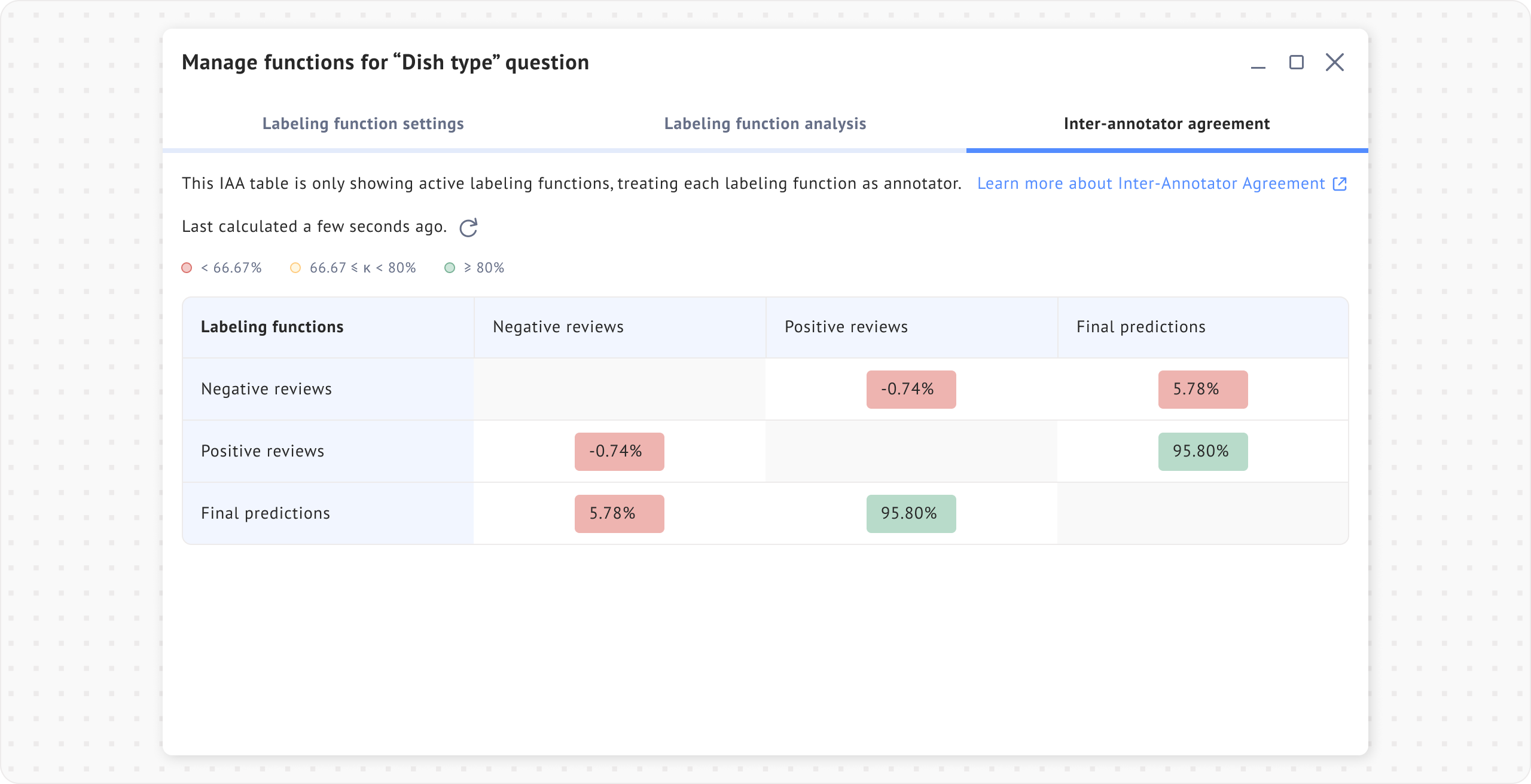 <figure><img src="https://448889121-files.gitbook.io/~/files/v0/b/gitbook-x-prod.appspot.com/o/spaces%2F-MbjY0HseEqu7LtYAt4d%2Fuploads%2Fgit-blob-7e3c74b1224dfb6a04c20b258ff92c6bbd533421%2FExtension%20-%20data%20programming%20-%20menu%20keywords%20-%20IAA.png?alt=media" alt=""><figcaption><p>Inter-annotator agreement for labeling functions</p></figcaption></figure>