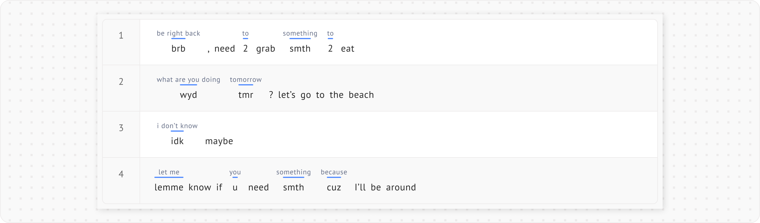 * For instance, common slang such as "cuz" can be identified and replaced with "because," and abbreviations like "ngl" can be replaced with their full forms like "not going to lie".