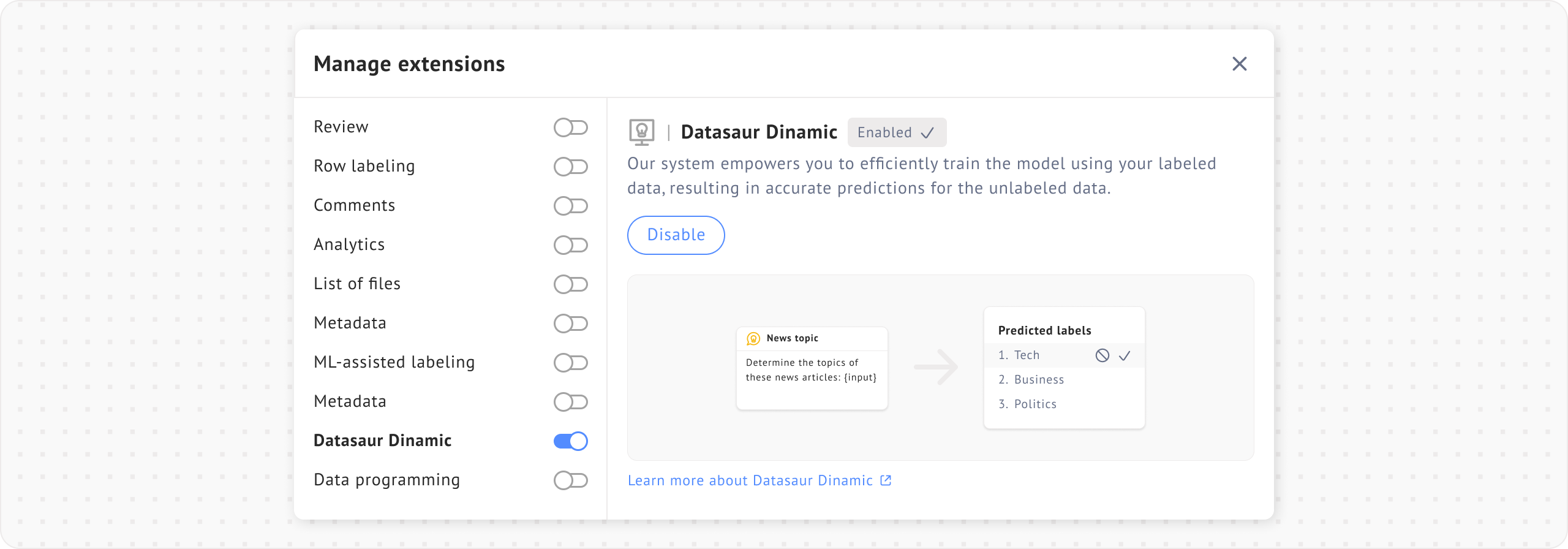 **Datasaur Dinamic** is a solution for you if you want to get the model directly rather than labeled data as an output. This built model can be deployed for your application and also can be used in **ML-assisted labeling** extension for your next labeling project. As an **ML-assisted labeling** provider, this model can return more accurate label because it was trained with your dataset previously.