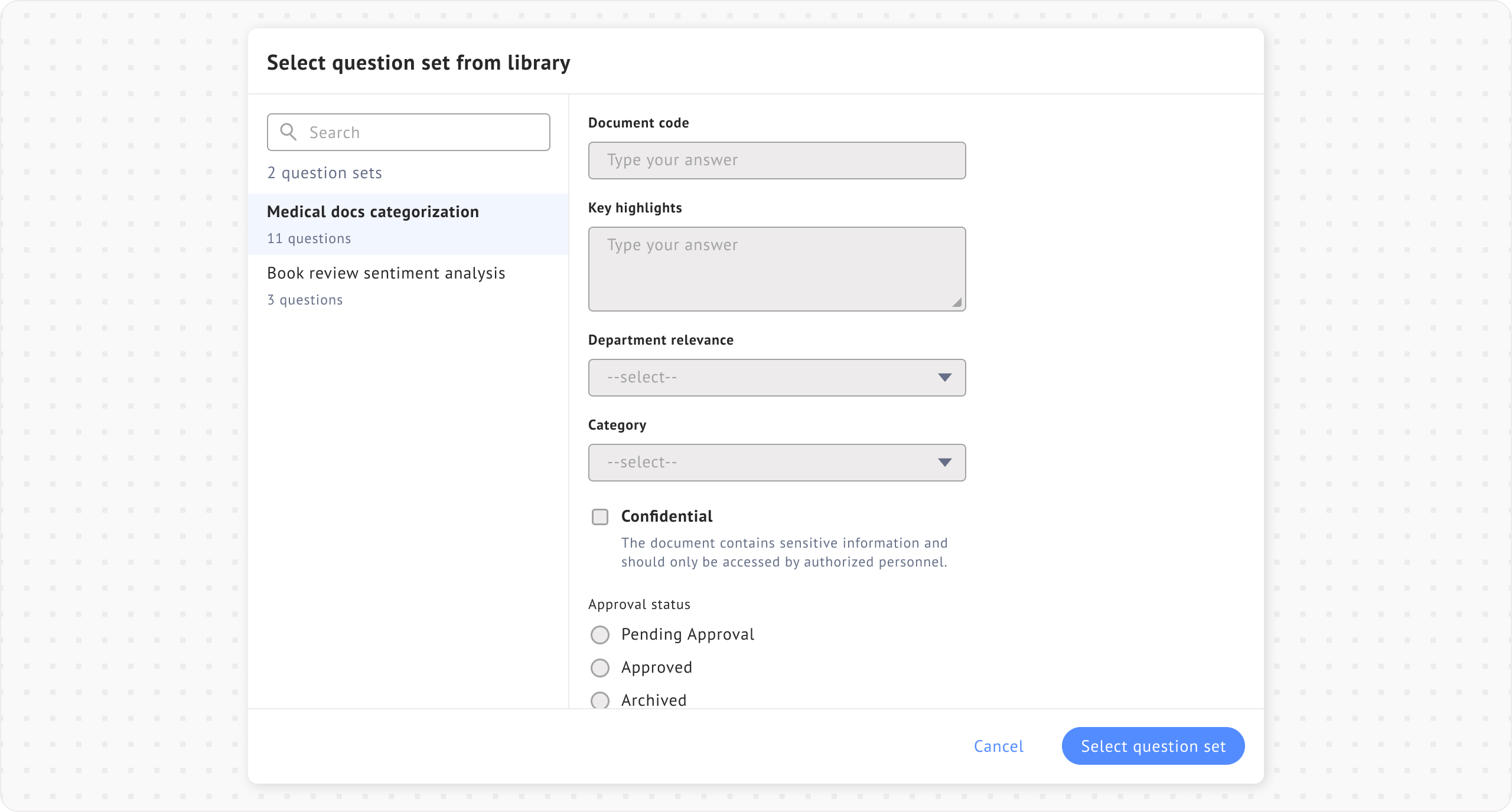 You can manage and update question sets either from the **Label management** page in your workspace or directly within a project. This includes adding new question sets, editing existing ones or removing them. Learn more about [label set management](https://datasaurai.gitbook.io/datasaur/workspace-management/label-management/label-set-management).
