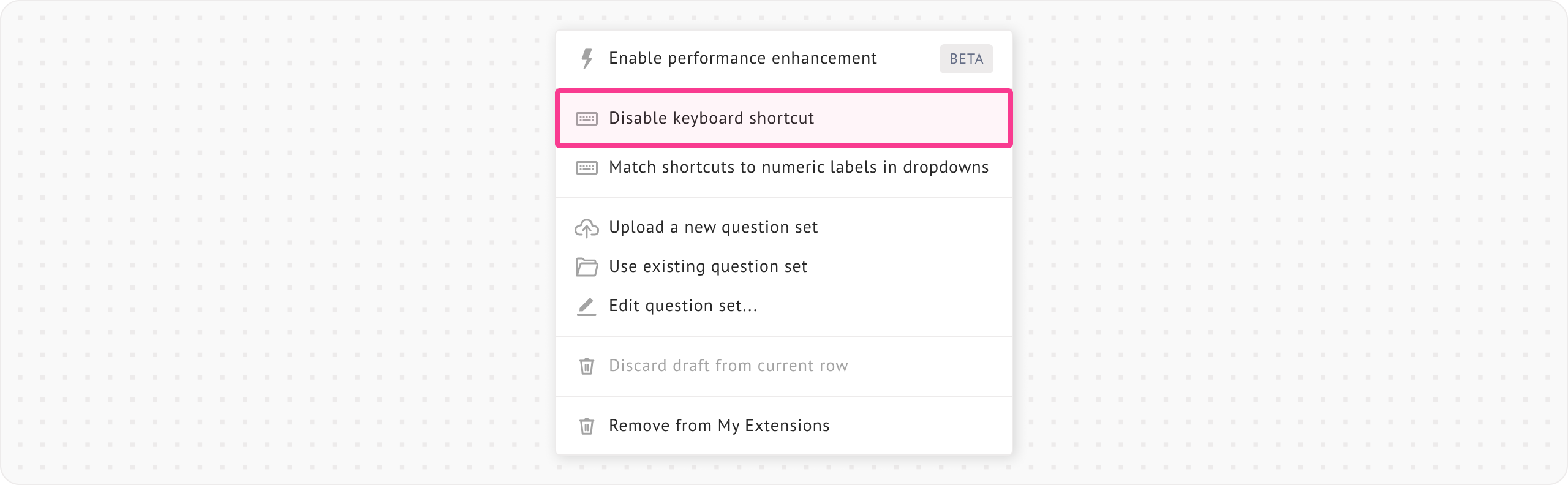 <figure><img src="https://448889121-files.gitbook.io/~/files/v0/b/gitbook-x-prod.appspot.com/o/spaces%2F-MbjY0HseEqu7LtYAt4d%2Fuploads%2Fgit-blob-2fbca061d6391c3c76ab9241f086c883a598ae7c%2FExtension%20%20-%20row%20doc%20labeling%20-%20more%20menu%20-%20Disable%20keyboard%20shortcut.png?alt=media" alt=""><figcaption></figcaption></figure>