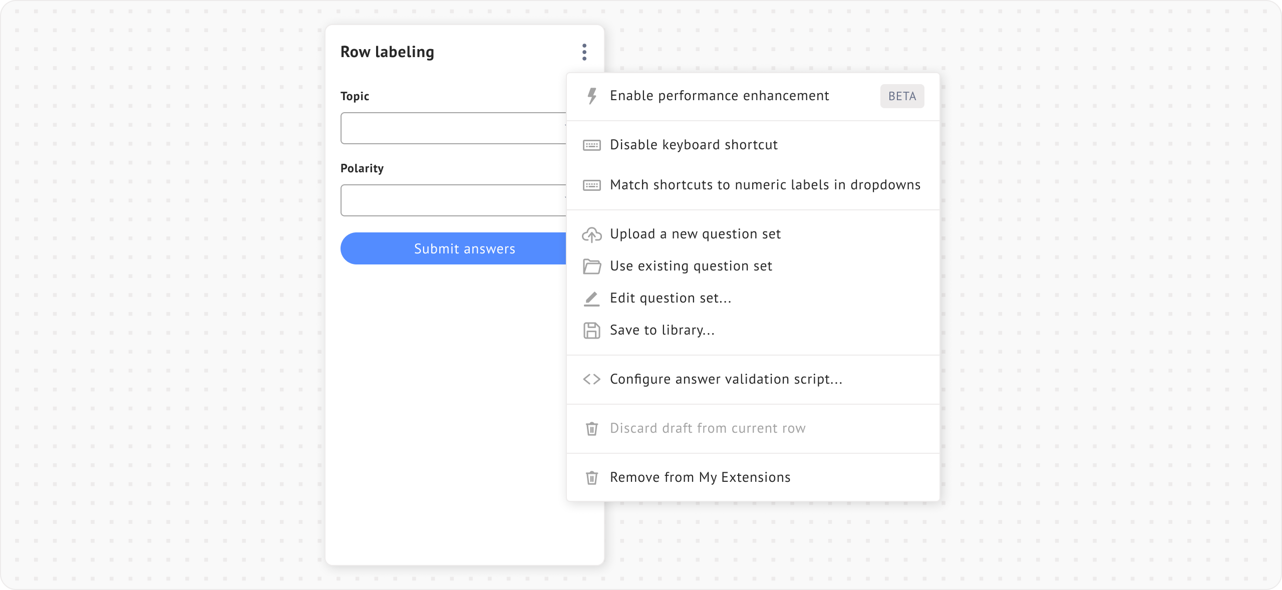 The **Document labeling** and **Row labeling** extensions are available for row and document labeling projects. Both extensions display the pre-configured questions set up during project creation, allowing users to answer questions related to each row or document.