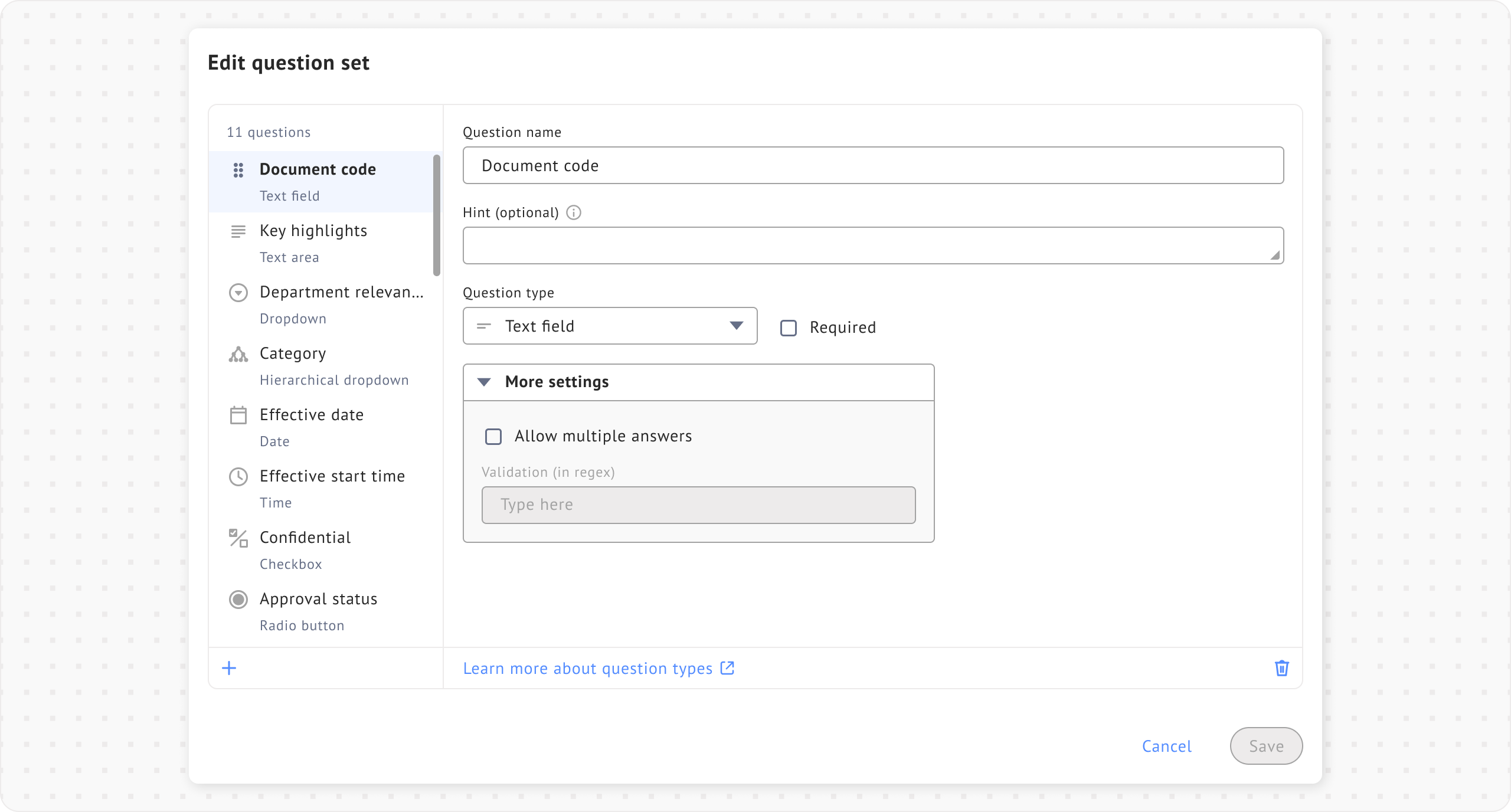 * **Regex validation**: Add or set regex rules to validate text input. If regex is changed, existing answers that fail the new pattern will prompt users to review them.