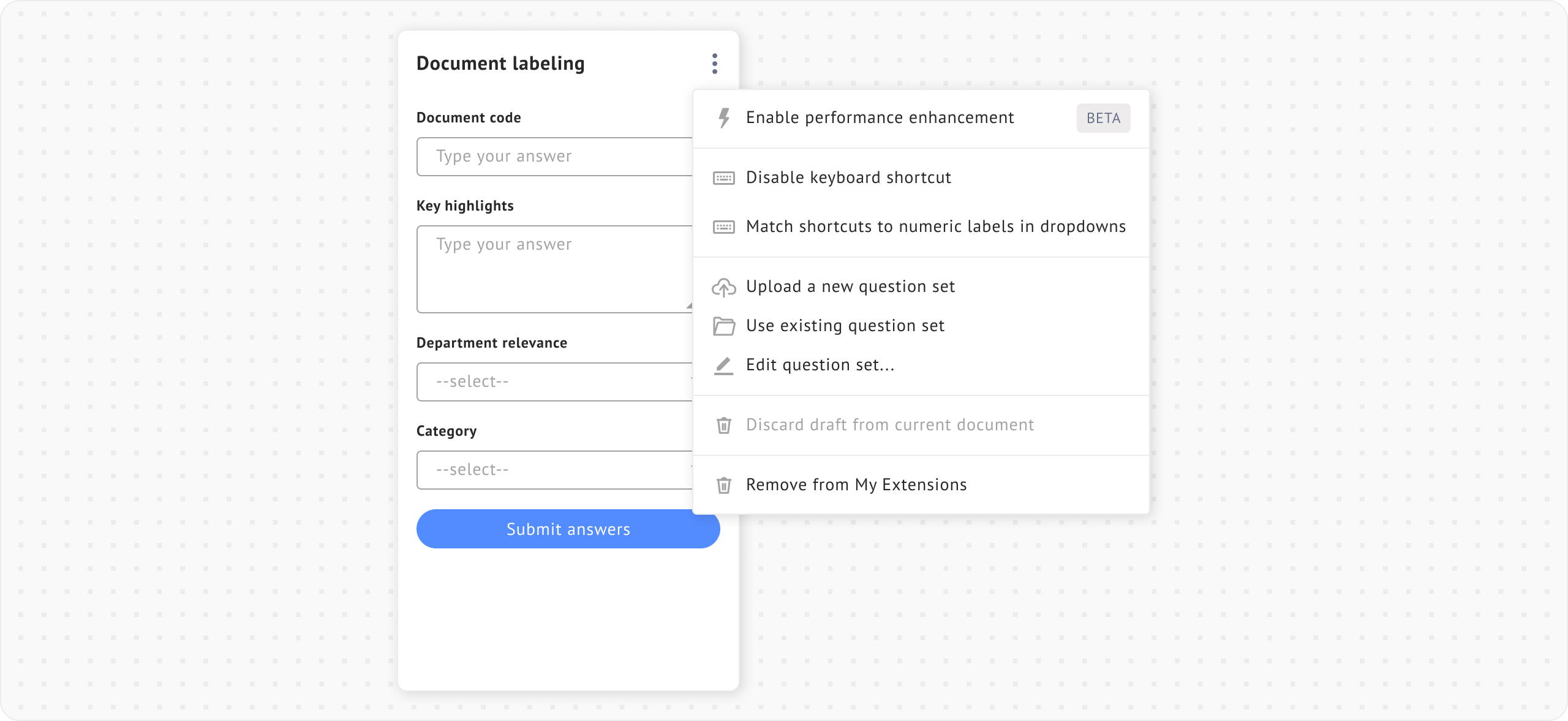 <figure><img src="https://448889121-files.gitbook.io/~/files/v0/b/gitbook-x-prod.appspot.com/o/spaces%2F-MbjY0HseEqu7LtYAt4d%2Fuploads%2Fgit-blob-f8dda44ae3445783c4dae3a164c19ef0662197b7%2FExtension%20%20-%20row%20doc%20labeling%20-%20document%20-%20more%20menu.png?alt=media" alt=""><figcaption><p>Document labeling extension</p></figcaption></figure>
