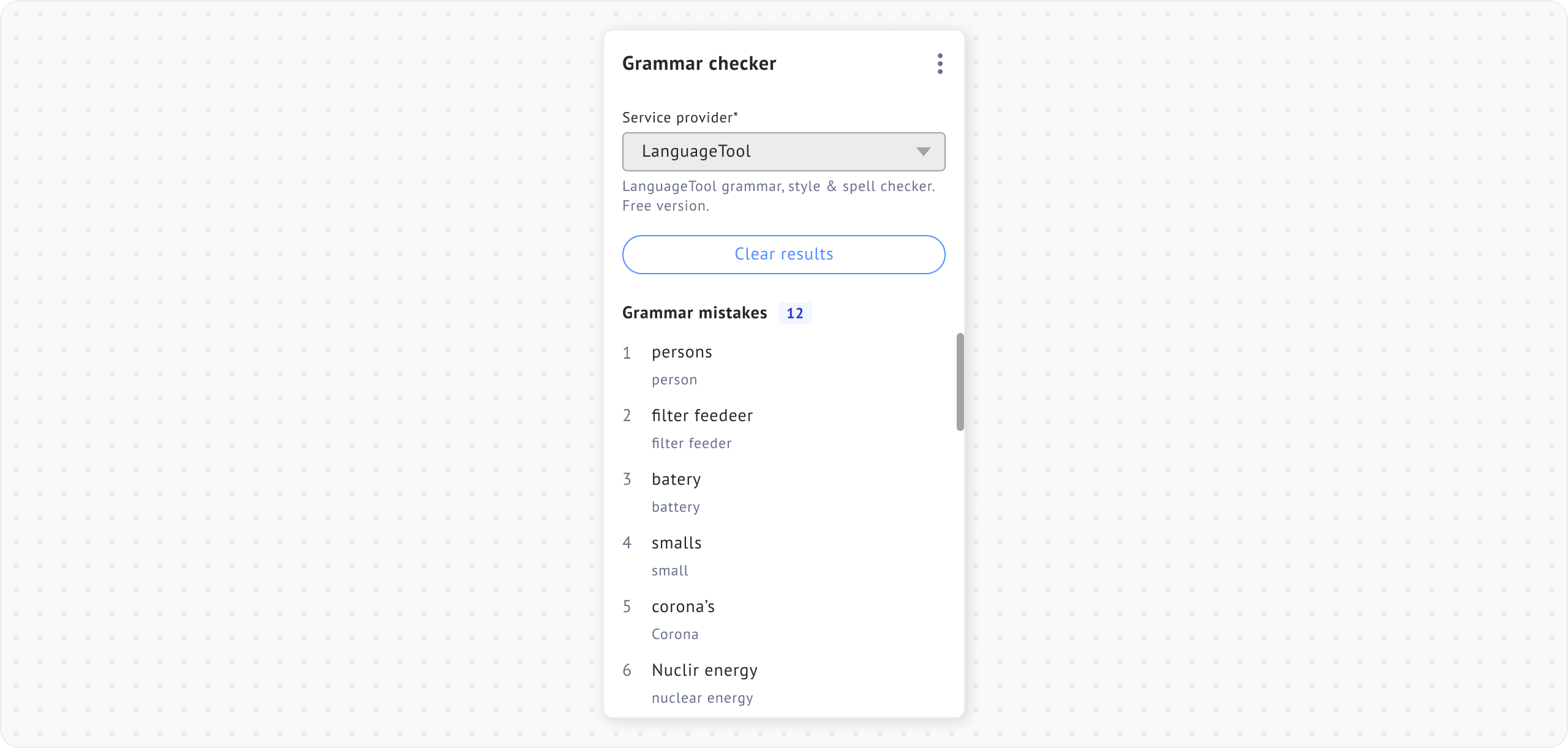 4. Click **Clear results** to clear the grammar mistake results