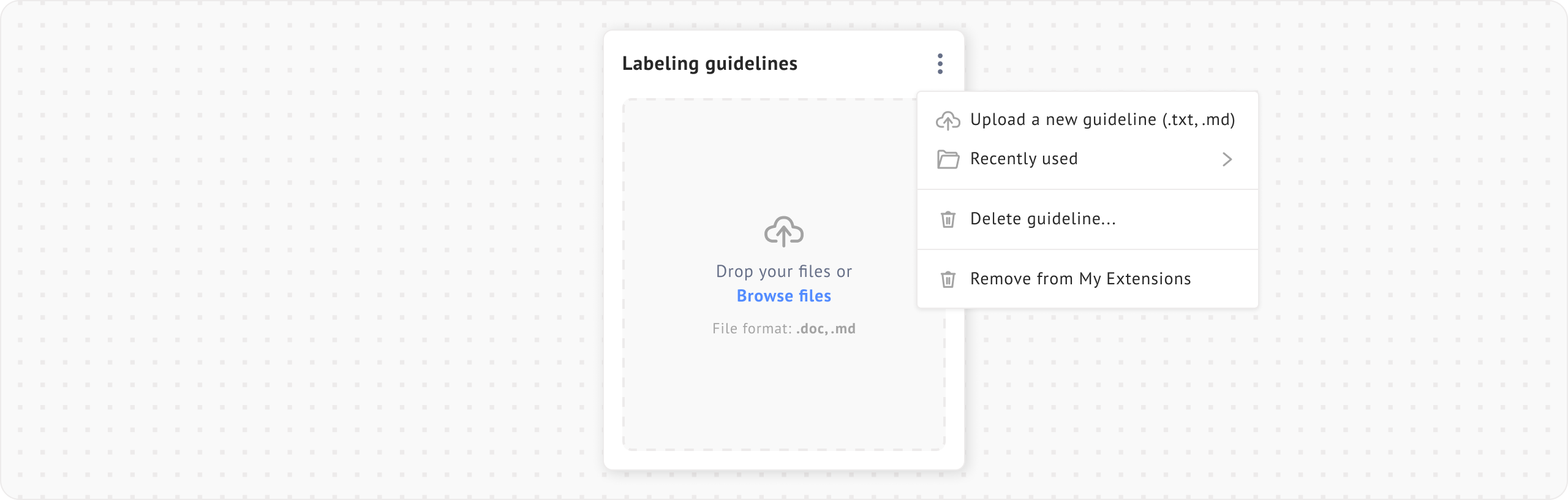 <figure><img src="https://448889121-files.gitbook.io/~/files/v0/b/gitbook-x-prod.appspot.com/o/spaces%2F-MbjY0HseEqu7LtYAt4d%2Fuploads%2Fgit-blob-4fc36d06ac28e5045c2992972f85eea814a7d864%2FExtension%20-%20labeling%20guidelines%20-%20more%20menu.png?alt=media" alt=""><figcaption></figcaption></figure>
