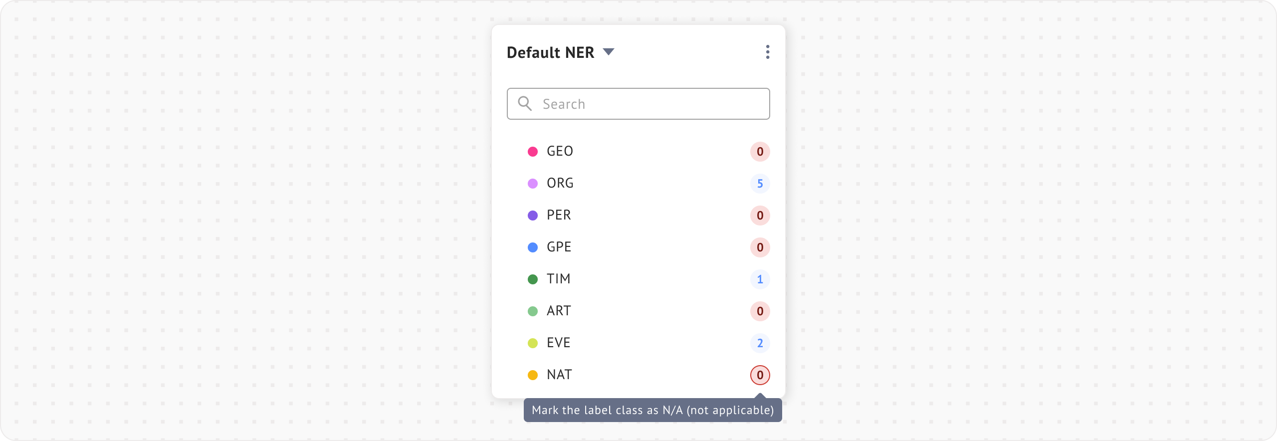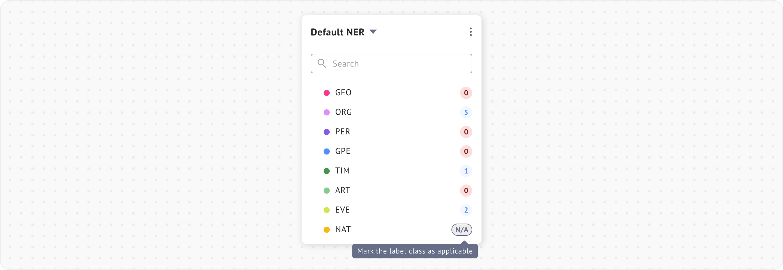 Once enabled, you can mark a label class as <mark style="color:red;">`N/A`</mark> (not applicable) within the extension. A label eligible for being marked as <mark style="color:red;">`N/A`</mark> is one that has not yet been applied to the document, indicated by an instance counter of <mark style="color:red;">`0`</mark> displayed in the extension.