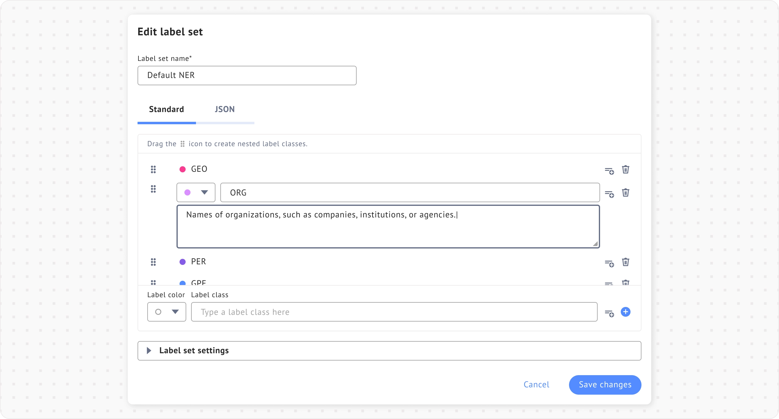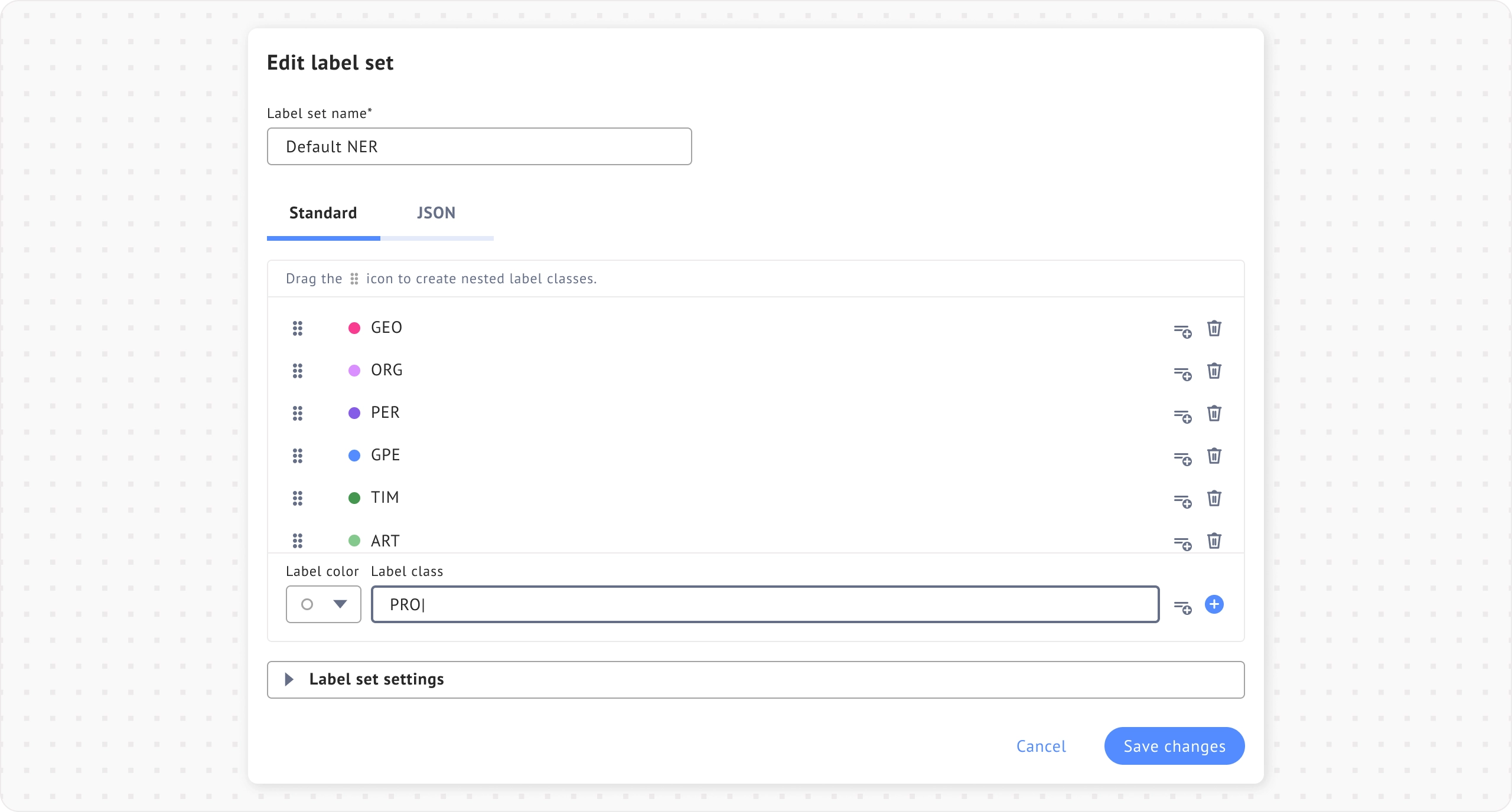 You can manage and update label sets either from the **Label management** page in your workspace or directly within a project. This includes adding new label sets, editing existing ones or removing them. Learn more about [label set management](https://datasaurai.gitbook.io/datasaur/workspace-management/label-management/label-set-management).