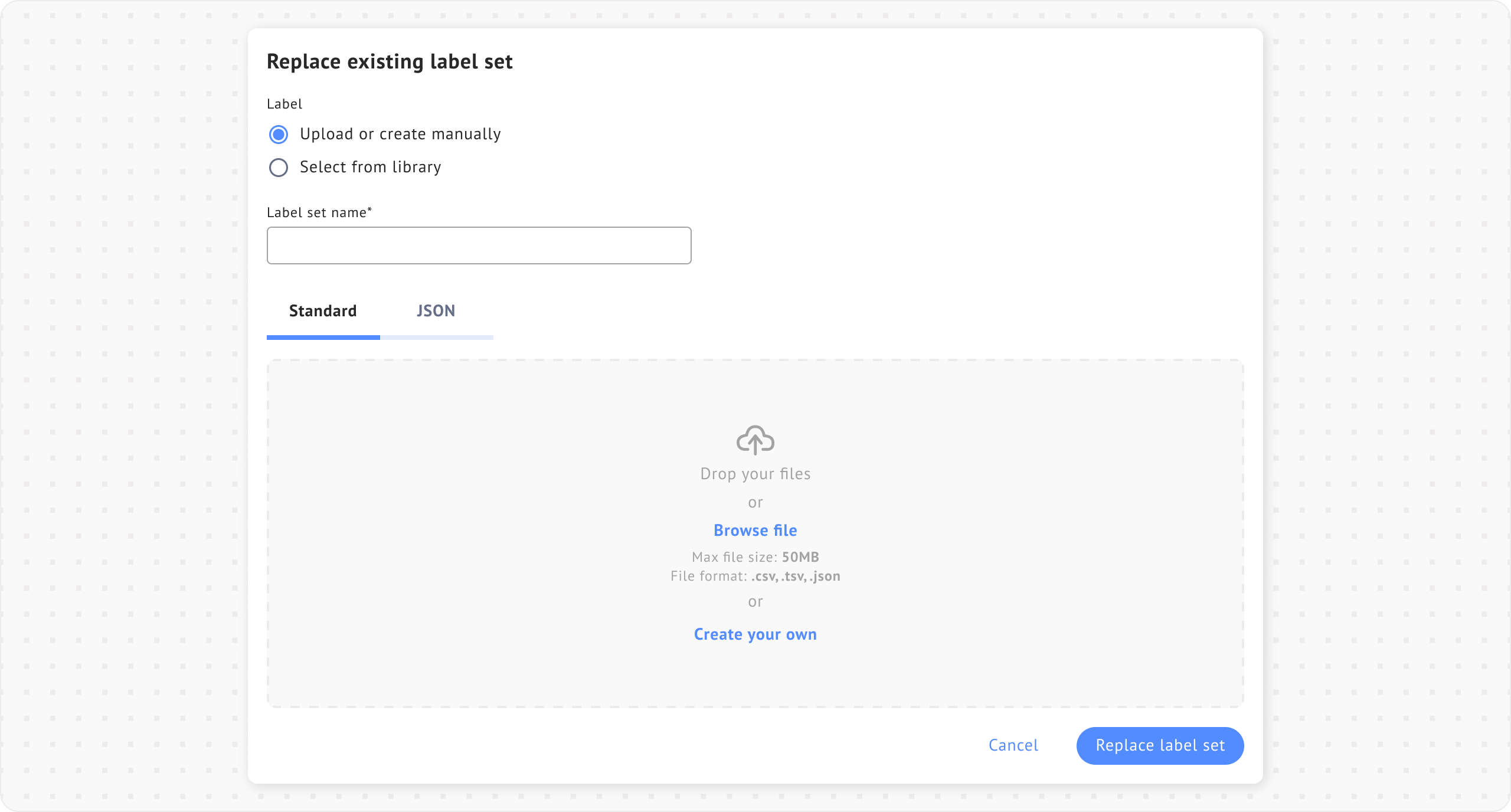 This option allows you to choose between upload/create manually or select one of the pre-stored label sets from the library. Doing so will replace the current label set in use and remove any existing labels associated with it.