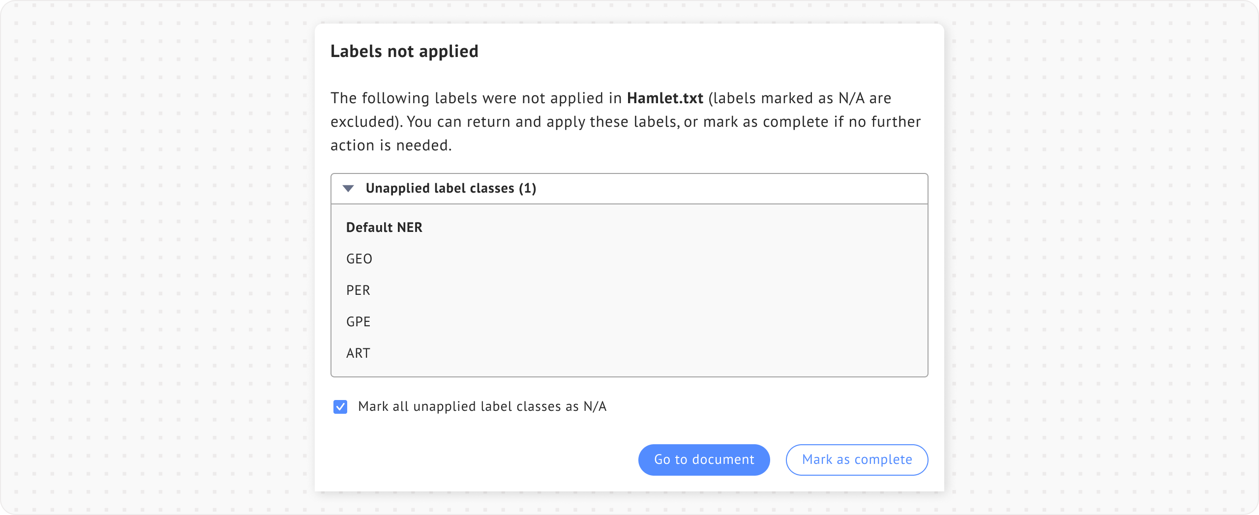When you mark a document as complete and there are label classes that have not been applied, a dialog box will appear displaying a list of these unapplied label classes. This list excludes any label classes that have already been marked as <mark style="color:red;">`N/A`</mark>, enabling you to review and take appropriate action.