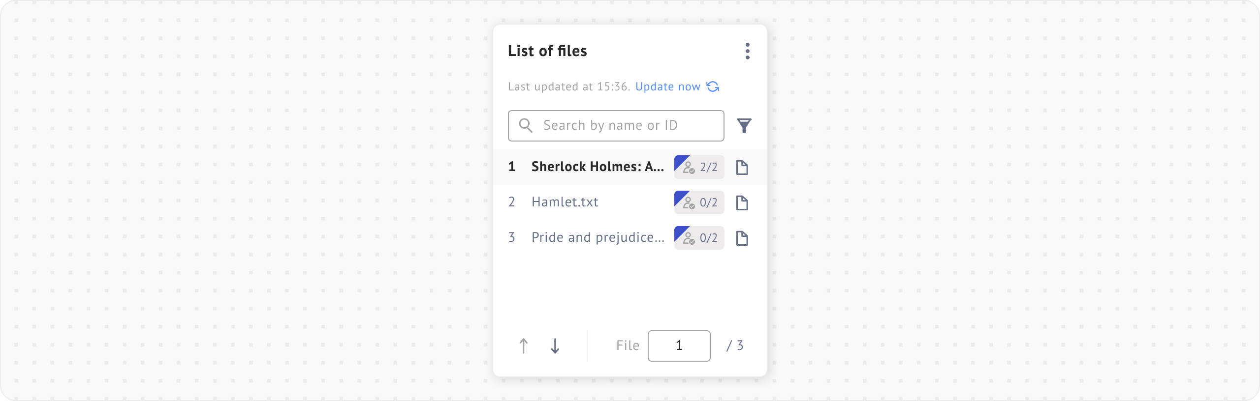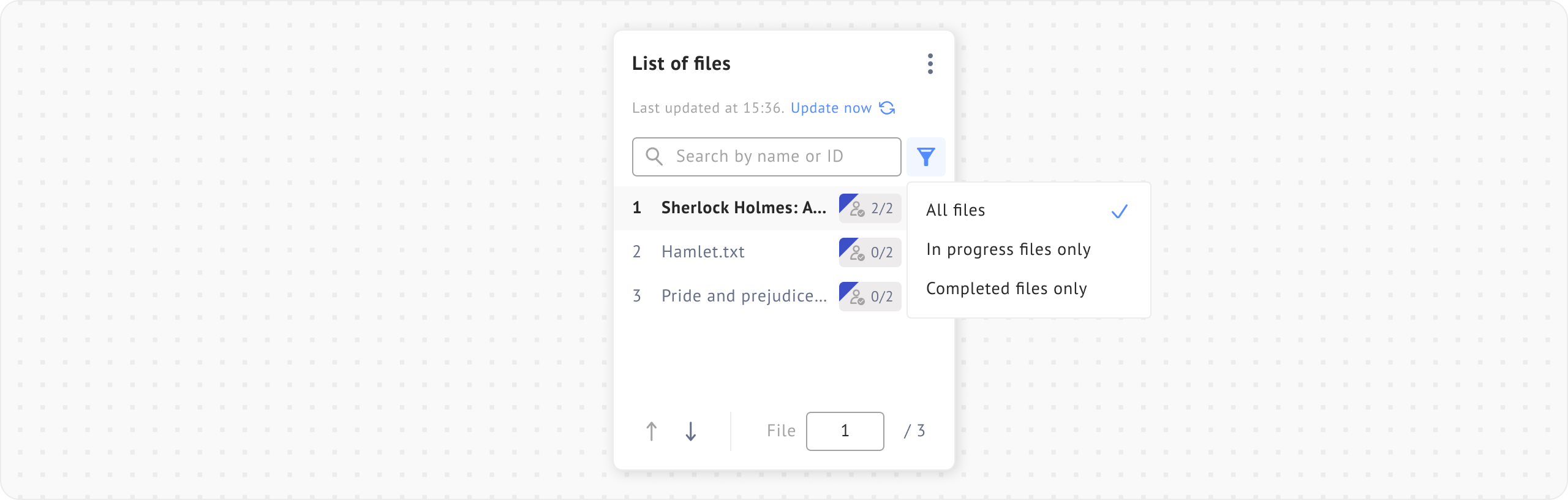 4. **File icon**: Displays the current status of the file, differentiating between files that have not been started and those that are completed. The status can be changed by clicking the icon.