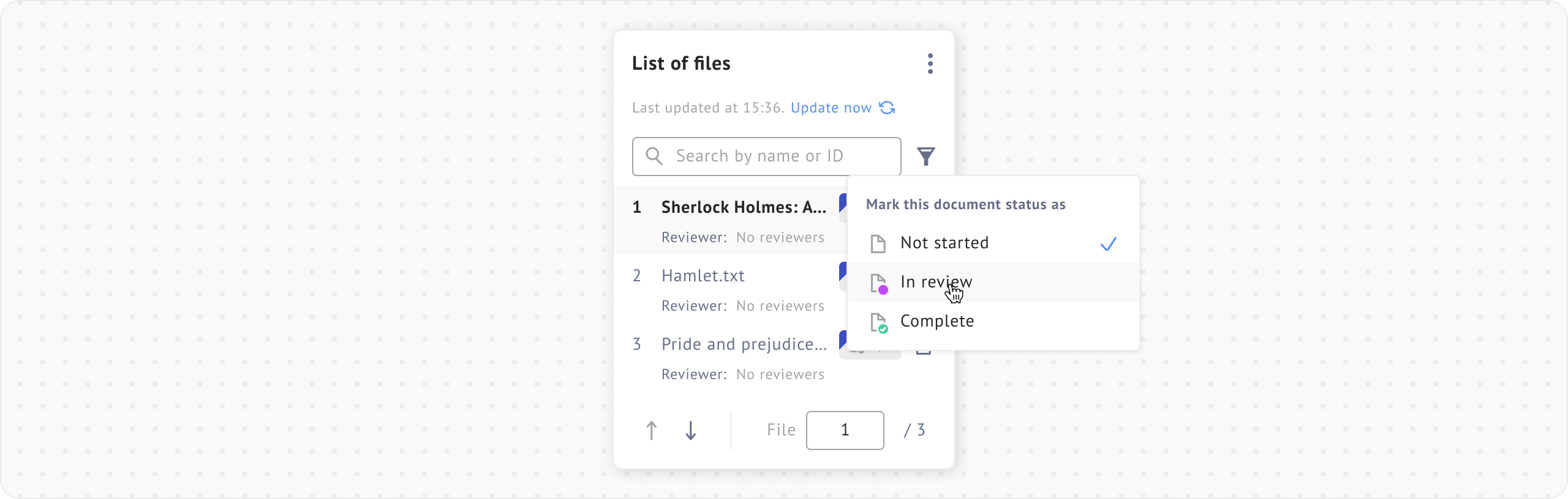 <figure><img src="https://448889121-files.gitbook.io/~/files/v0/b/gitbook-x-prod.appspot.com/o/spaces%2F-MbjY0HseEqu7LtYAt4d%2Fuploads%2Fgit-blob-3a26f8998b3c3bad668541c8f4a48aa59fbf151d%2FExtension%20-%20List%20of%20files%20-%20reviewer%20mode%20-%20mark%20document%20status.png?alt=media" alt=""><figcaption></figcaption></figure>
