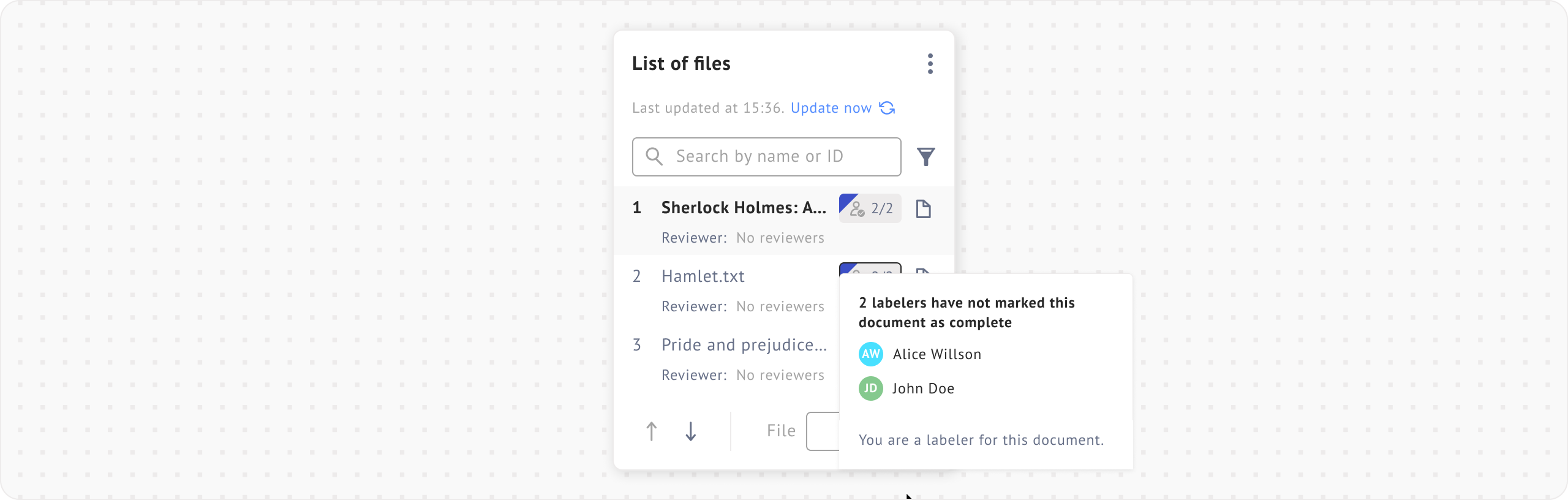 1. Hovering over the indicator reveals which labelers still need to complete the file.