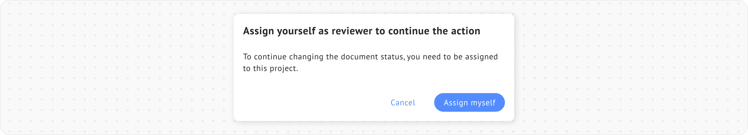 If a user who is not assigned to the project attempts to change the document's status, they will need to be assigned as a reviewer for the project first. A dialog box will automatically appear, asking the user to confirm that they wish to assign themselves as a reviewer. Once confirmed, the user can proceed to change the document's status.