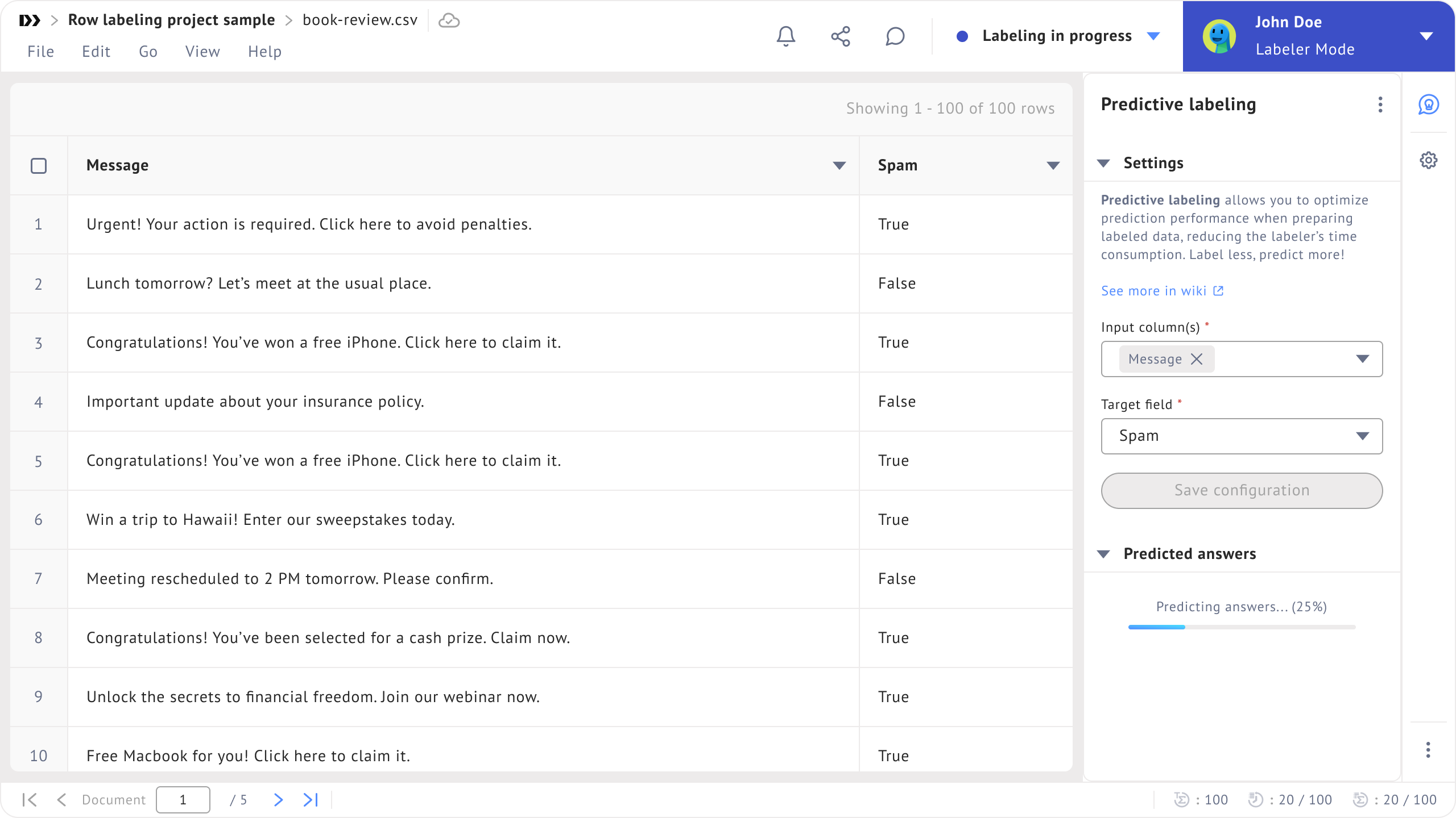 4. Predicting the labels: You can select the **Input column(s)** as the context, in this case, it will be **Message** and the **Target field** as the column for the predicted answer. Then, click **Save configuration**. Voilà, the **Predictive labeling** extension has automatically predicted all the labels.