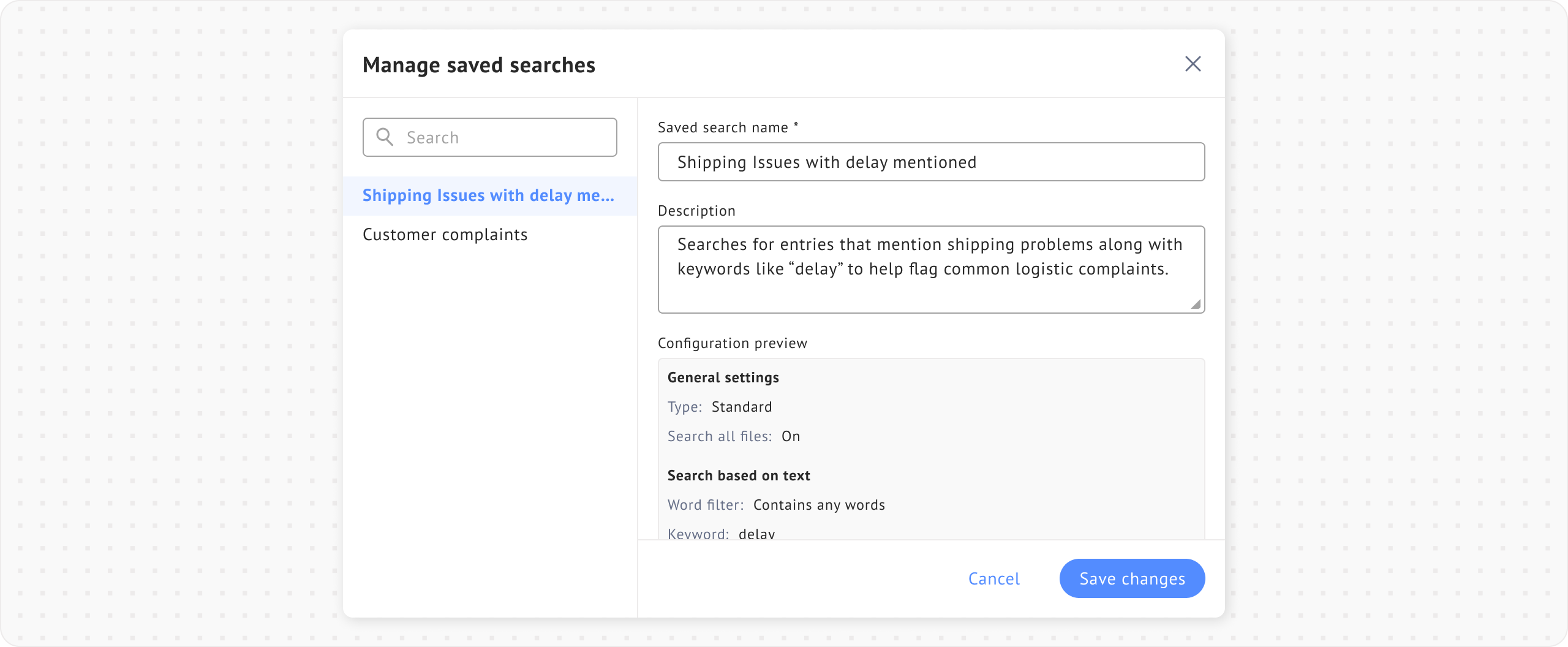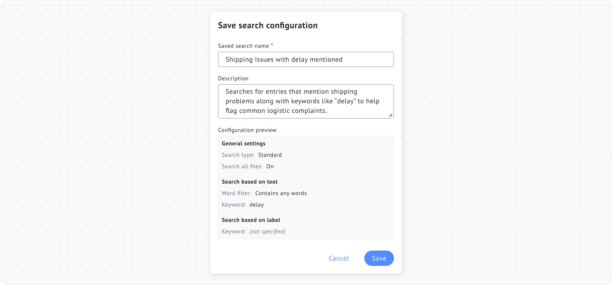Clicking this option will open a dialog where you can enter a name and description for the saved search, including a preview of the current search configuration.