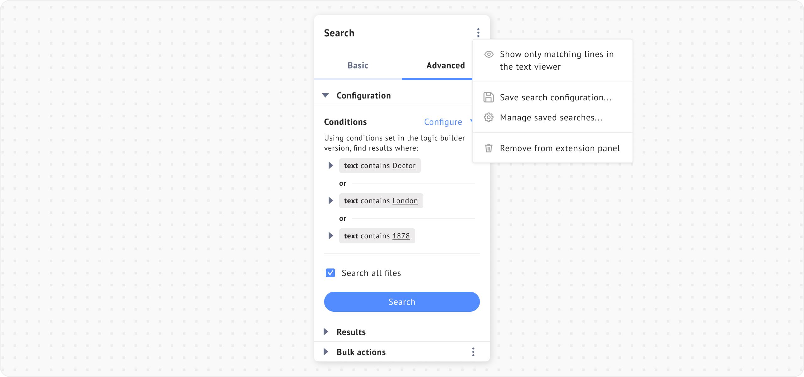 To improve readability, users can enable **Show only matching lines in the text viewer** from the three-dot menu in the top-right corner of the extension. When enabled, non-matching lines are hidden, allowing users to focus only on relevant results in the text viewer.