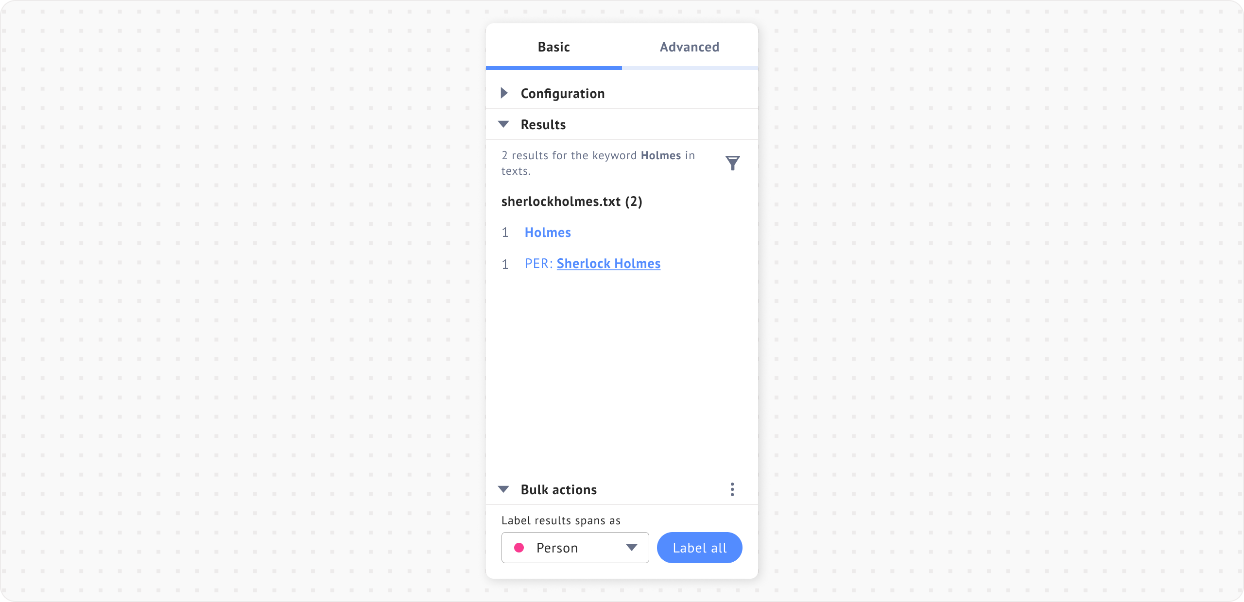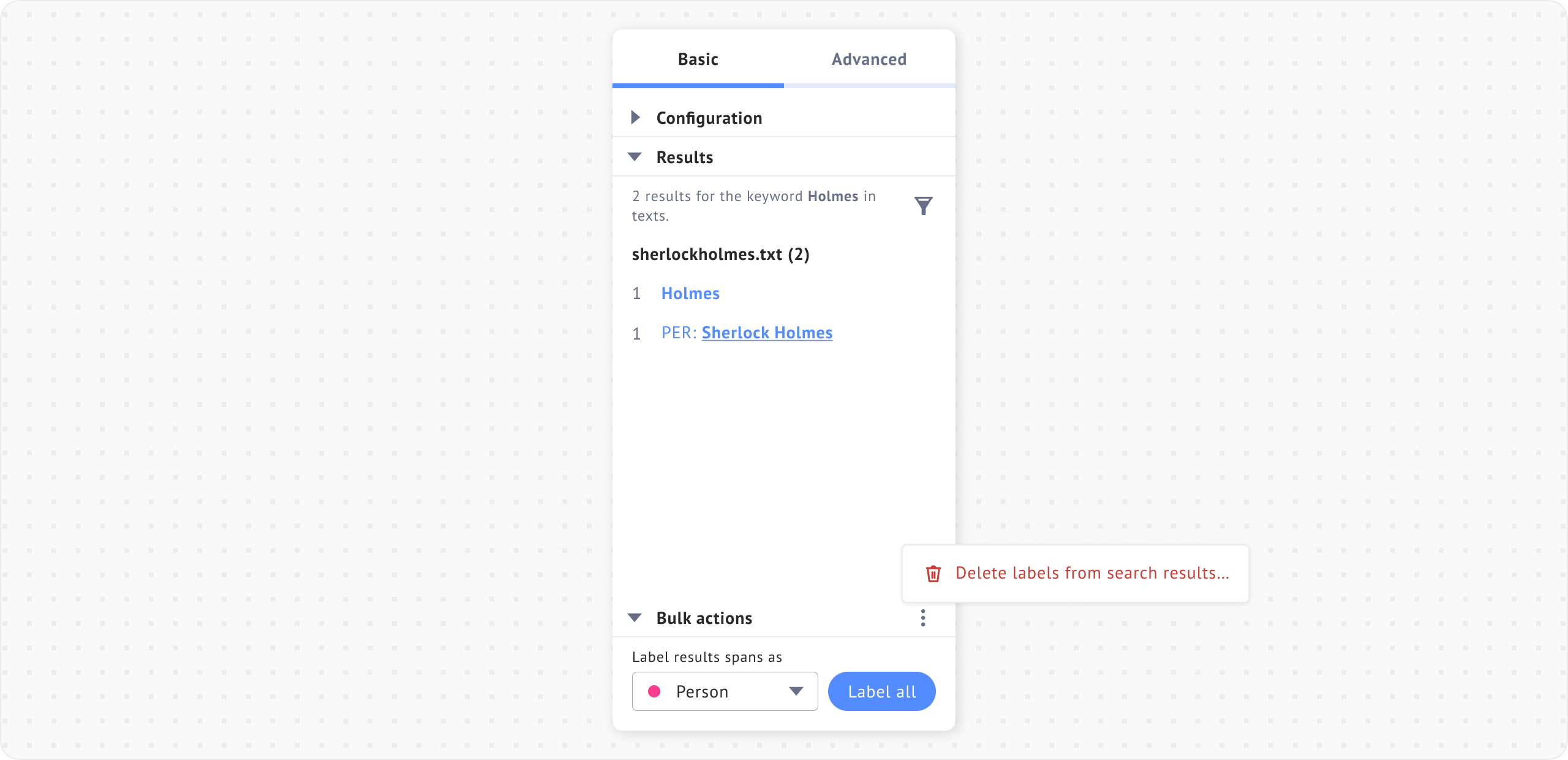 For example, searching for the text <mark style="color:red;">`Holmes`</mark> will show all its instances in the document. Selecting <mark style="color:red;">`Person`</mark> from the dropdown and clicking **Label all** applies the <mark style="color:red;">`Person`</mark> label to every occurrence of <mark style="color:red;">`Holmes`</mark>.