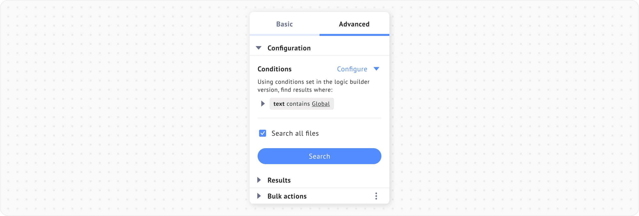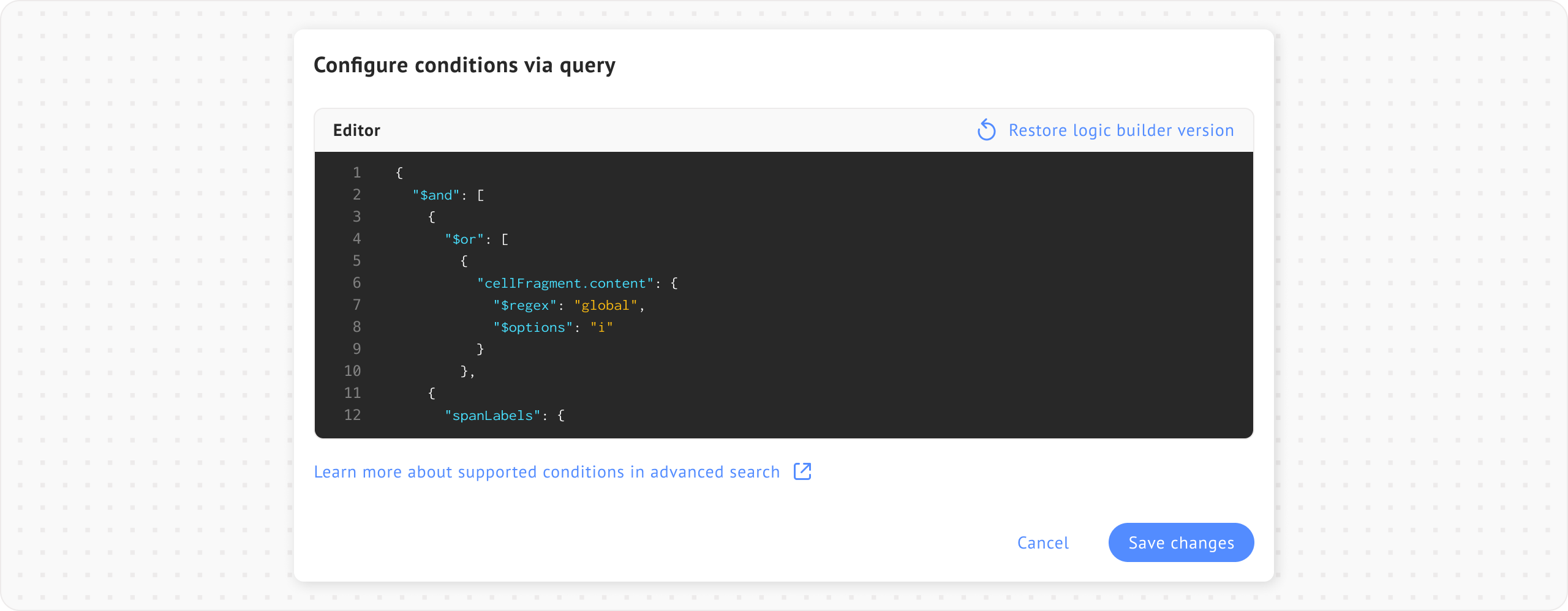 The **Advanced search** provides a more sophisticated way to search by allowing the combination of multiple conditions to refine results. This search type supports complex queries using MongoDB query syntax.