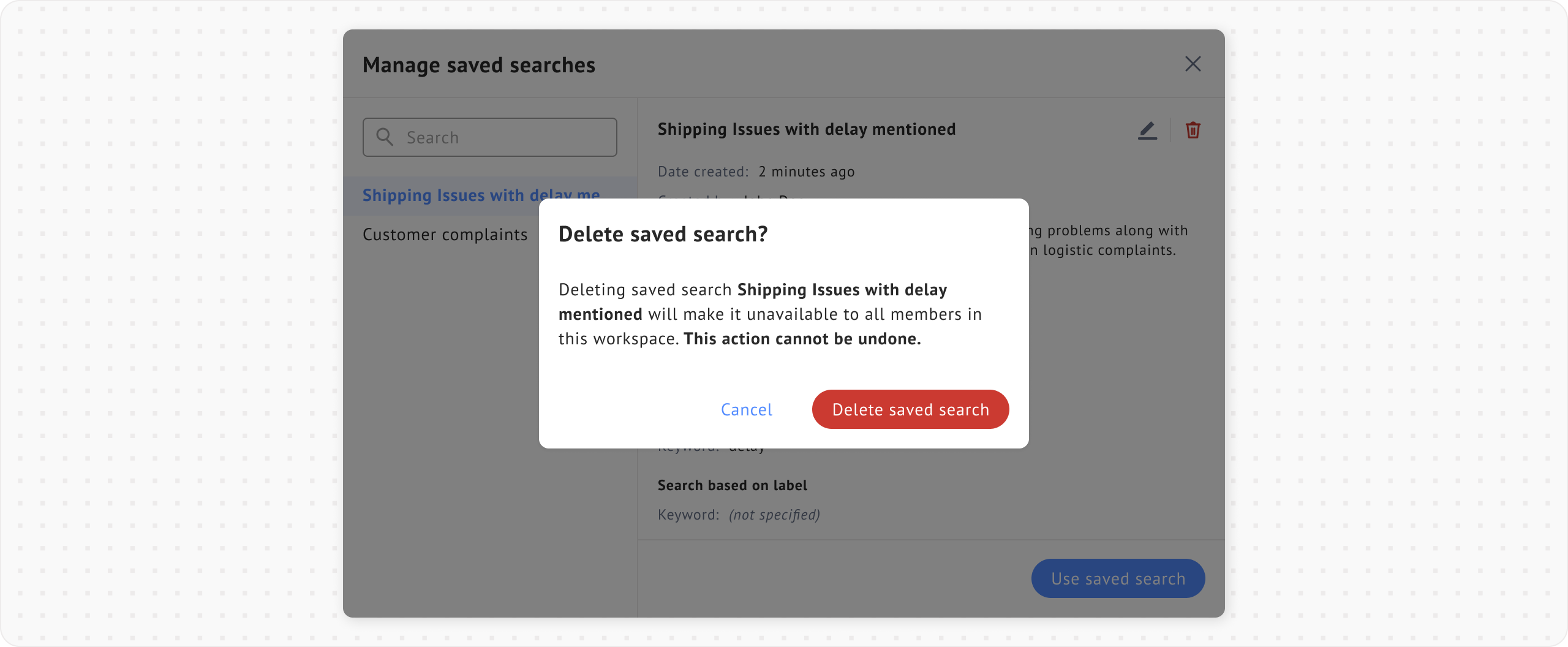 Clicking the “Delete” button will open a confirmation dialog. Confirm the action to permanently delete the saved search.