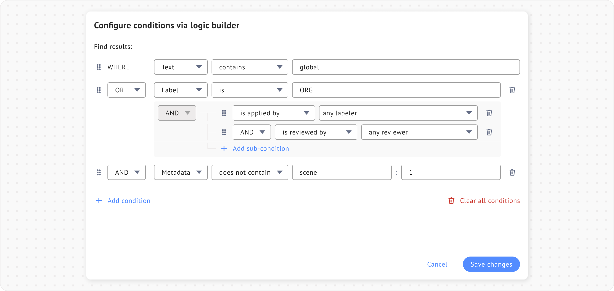 * <mark style="color:red;">**`is reviewed by`**</mark>: Matches labels that were reviewed by the selected user, or by any user if “any reviewer” is selected (both accepted and rejected).