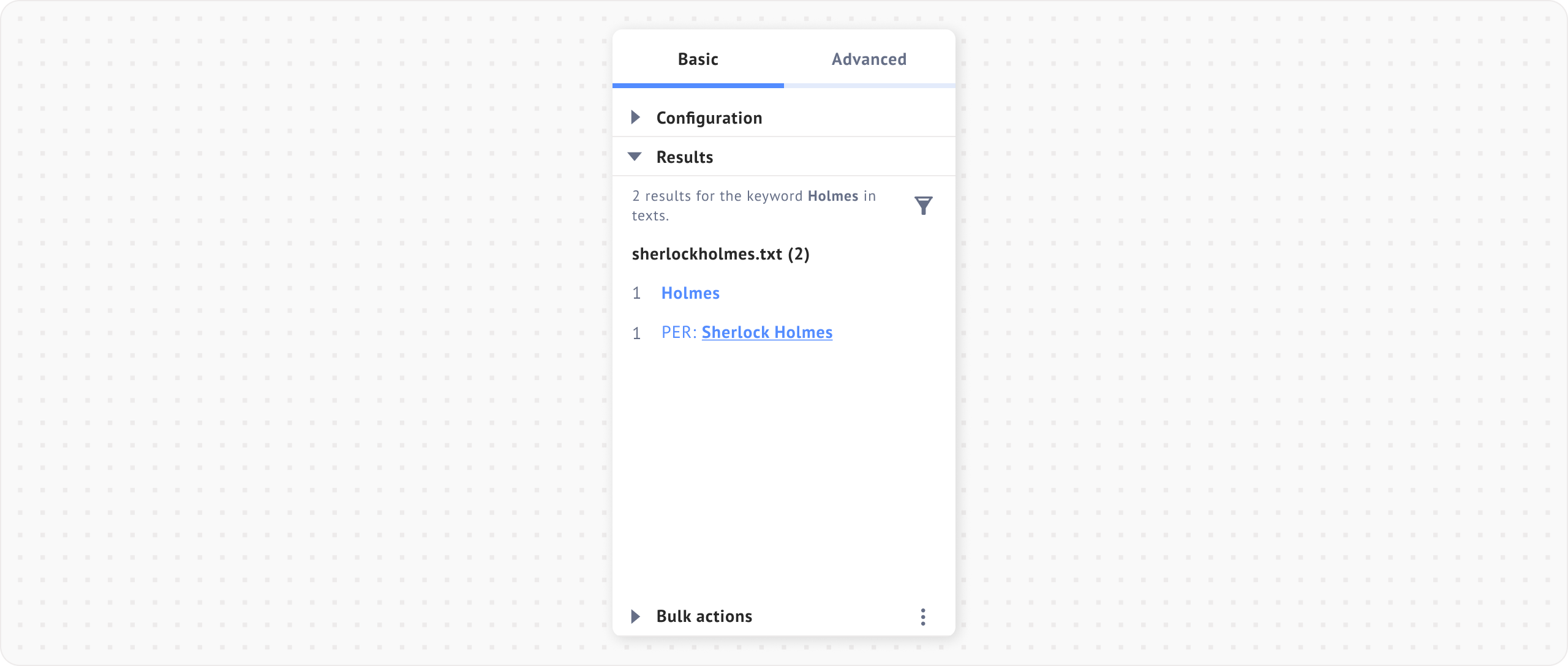 The **Standard search** allows users to perform simple searches based on text and labels using keywords or regular expressions (regex). This search type is intuitive and provides quick access to relevant data by matching the input with the text or labels in the project.