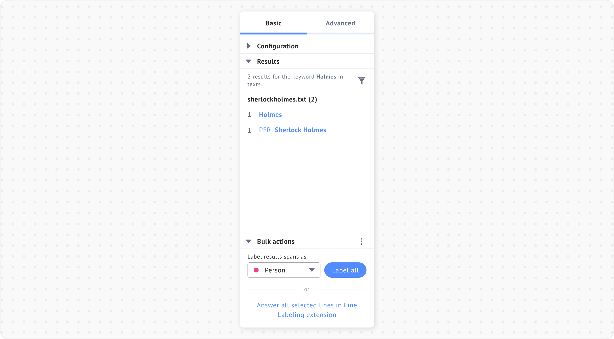 The **Answer matching lines in line labeling extension** allows users to apply the same answer to all matching lines from the search results in a project.
