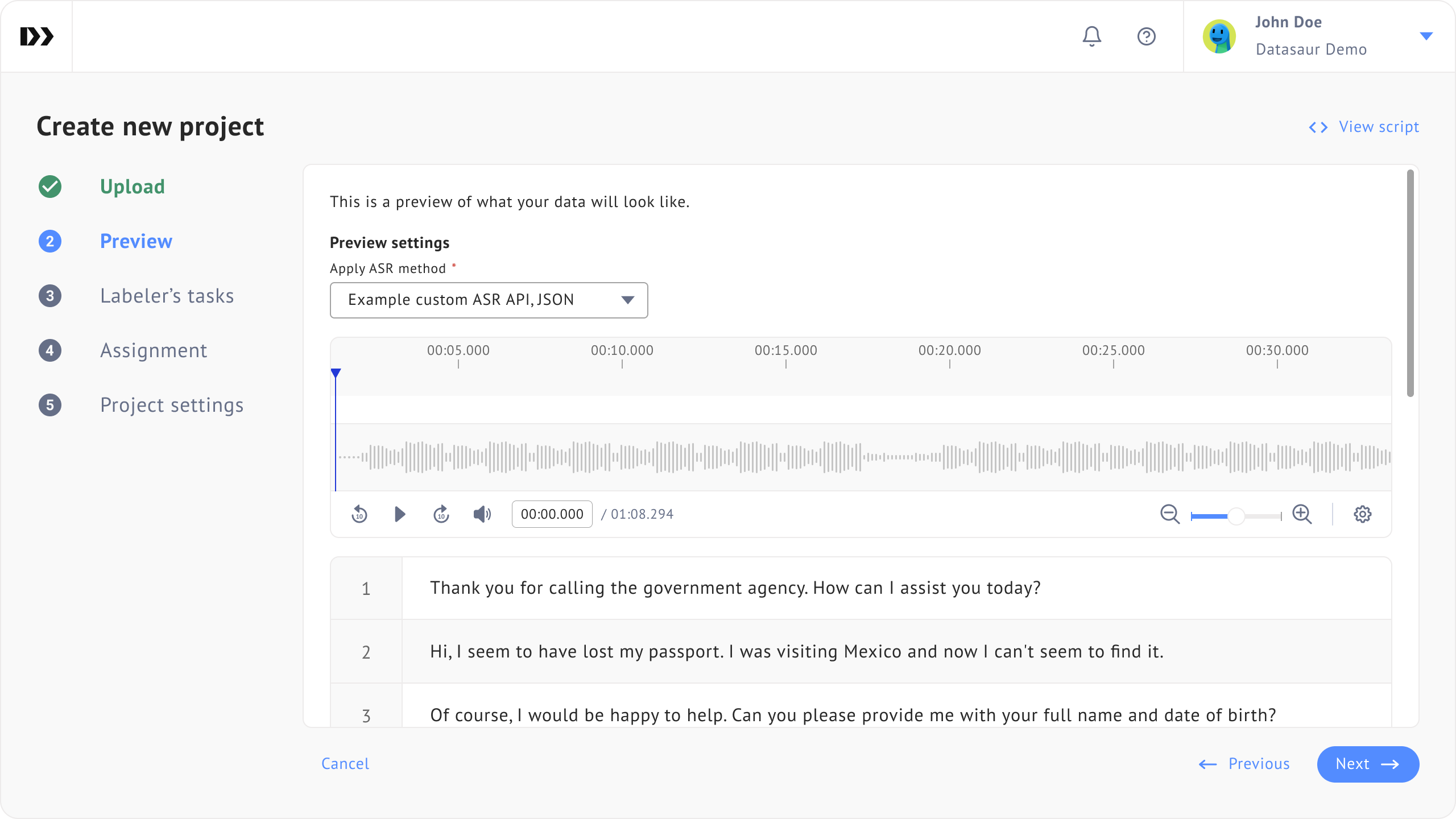 {% file src="<https://448889121-files.gitbook.io/~/files/v0/b/gitbook-x-prod.appspot.com/o/spaces%2F-MbjY0HseEqu7LtYAt4d%2Fuploads%2Fgit-blob-84338de20b4630578209d11b8e58c2bf3df18939%2FDatasaur%20sample%20-%20ASR.mp3?alt=media&token=f9117b46-c6ef-4fa8-b765-92ac3f746d09>" %}