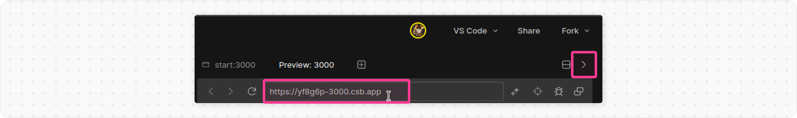 3. Copy the **base URL** of the API from the CodeSandbox preview panel (on the right-hand side). In addition, you may need to ensure the panel is expanded if it’s collapsed.