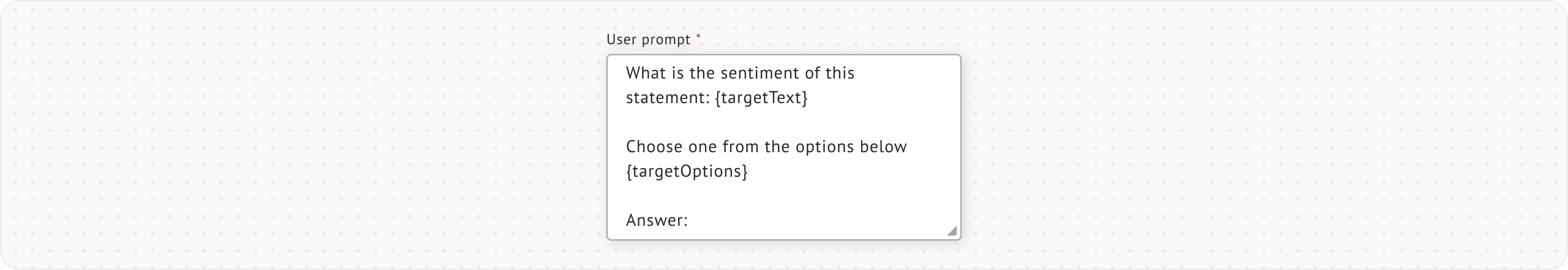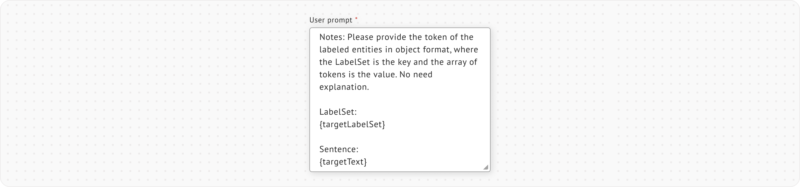 <figure><img src="https://448889121-files.gitbook.io/~/files/v0/b/gitbook-x-prod.appspot.com/o/spaces%2F-MbjY0HseEqu7LtYAt4d%2Fuploads%2Fgit-blob-42b2b56ddb91eb5af4ad1756496e7b552a610570%2FExtension%20-%20ML-assisted%20Labeling%20-%20Span%20labeling%20-%20LLM%20Assisted%20Labeling%20-%20user%20prompt.png?alt=media" alt=""><figcaption></figcaption></figure>