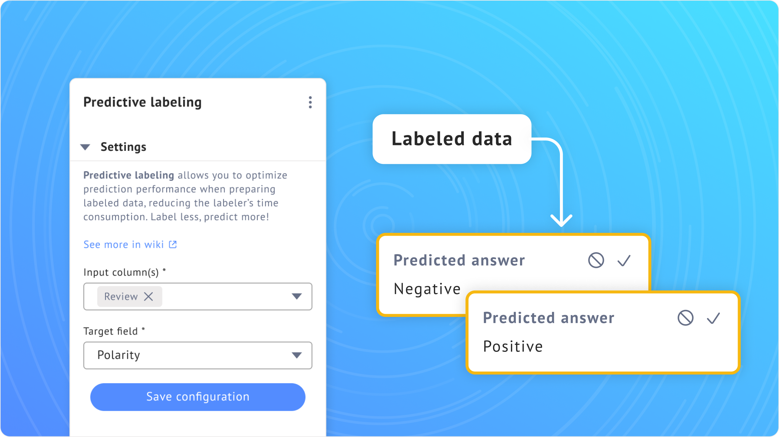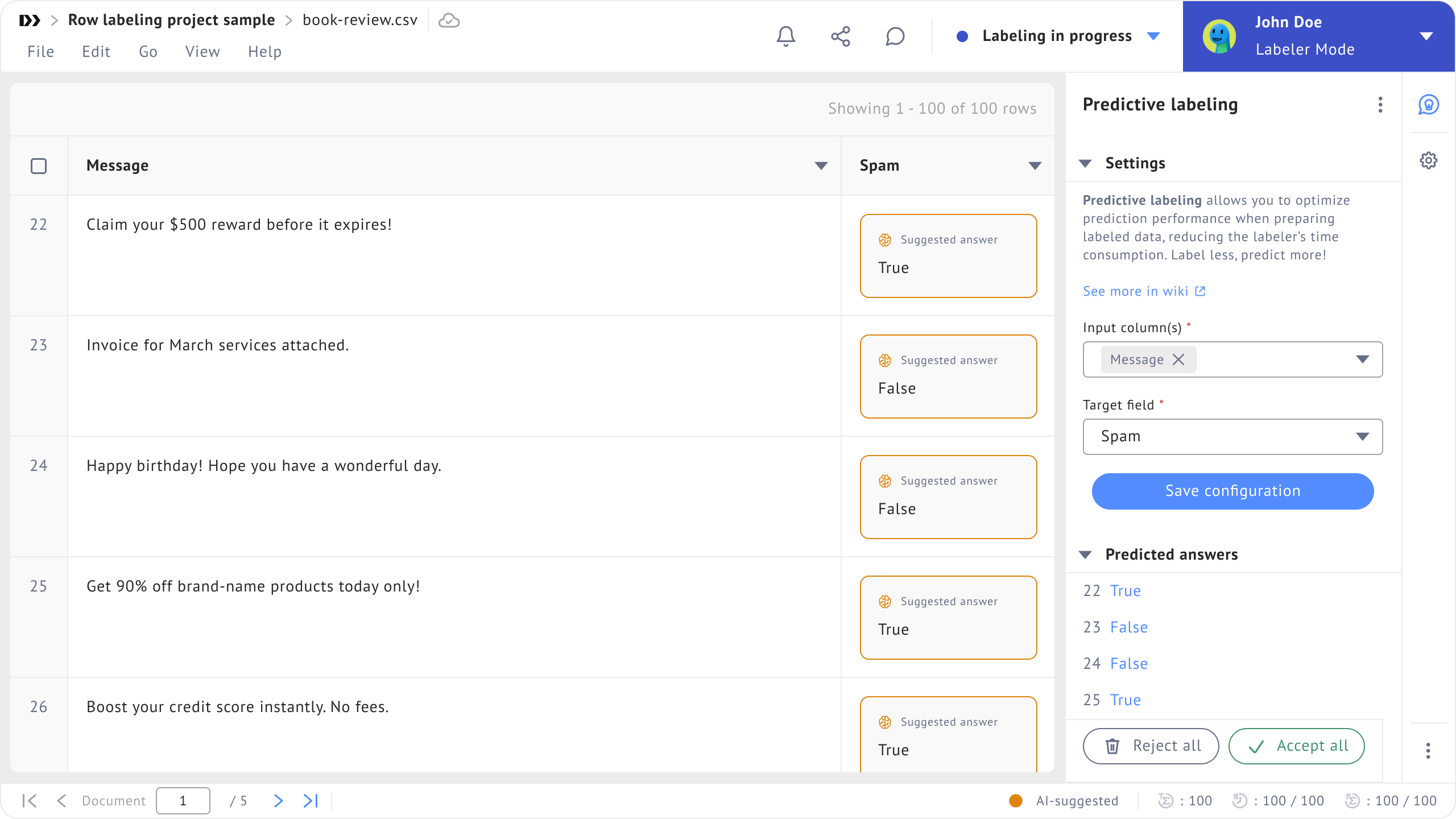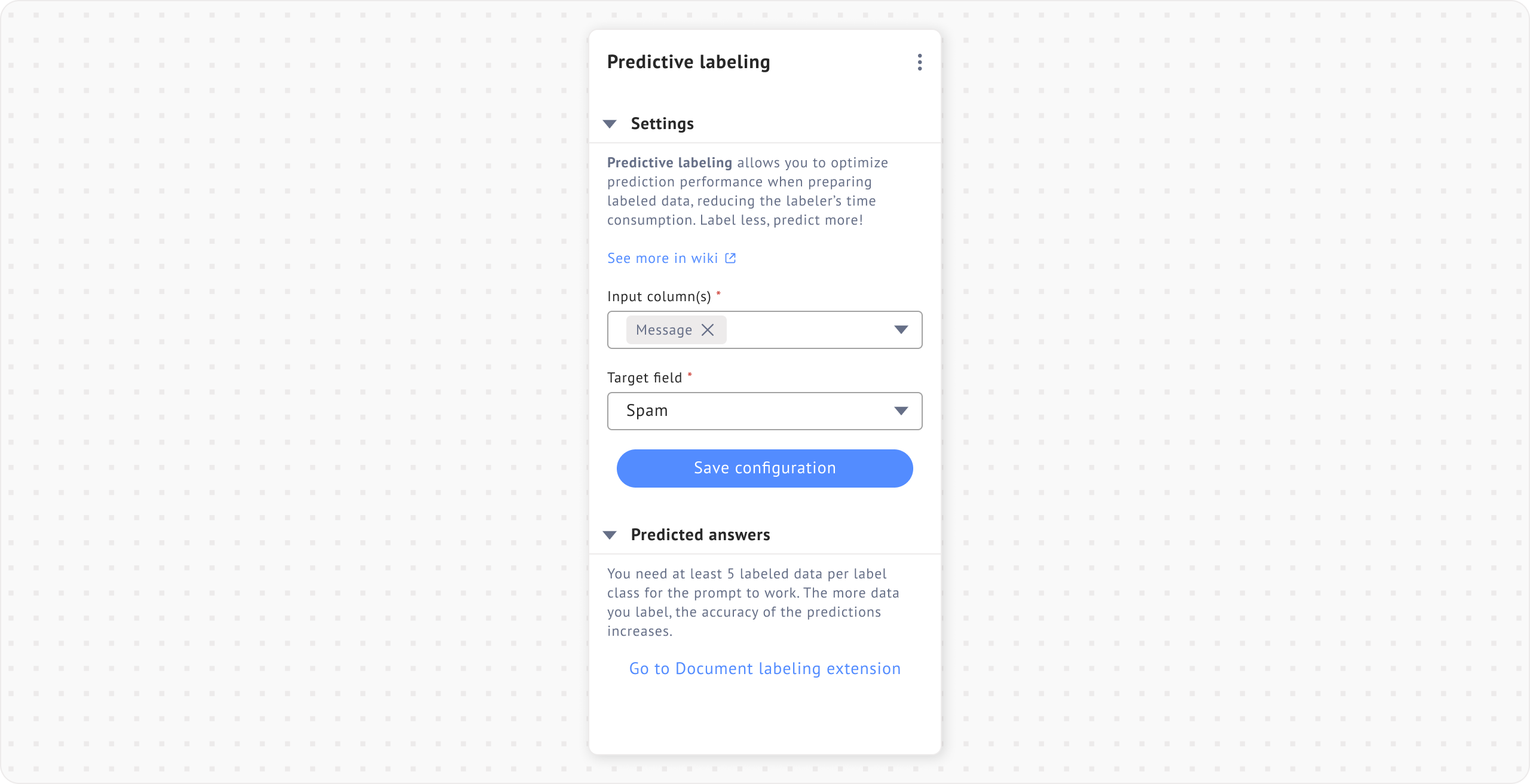 Click **Save configuration** to start the prediction. If the project already contains some labeled data, the system will immediately start showing predictions. If not, it is necessary to label a minimum of 5 data points for each category of the answer.