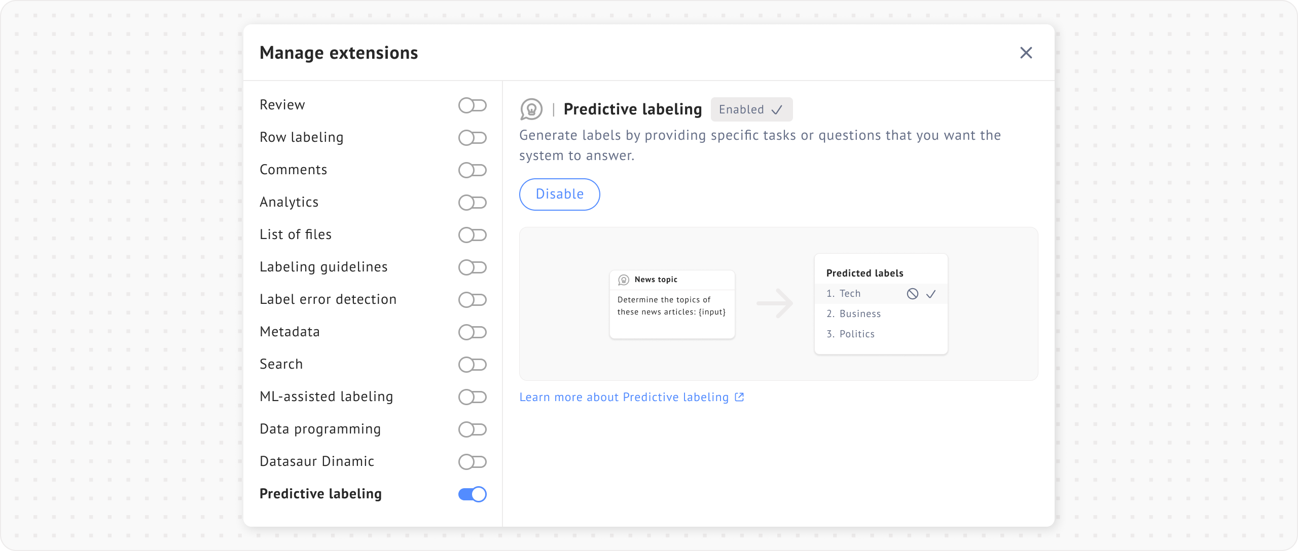 <figure><img src="https://448889121-files.gitbook.io/~/files/v0/b/gitbook-x-prod.appspot.com/o/spaces%2F-MbjY0HseEqu7LtYAt4d%2Fuploads%2Fgit-blob-8c1fe60f8e099c41be3844f68f710590550ddd71%2FExtension%20-%20Manage%20extensions%20-%20Predictive%20labeling.png?alt=media" alt=""><figcaption><p>Manage extensions</p></figcaption></figure>