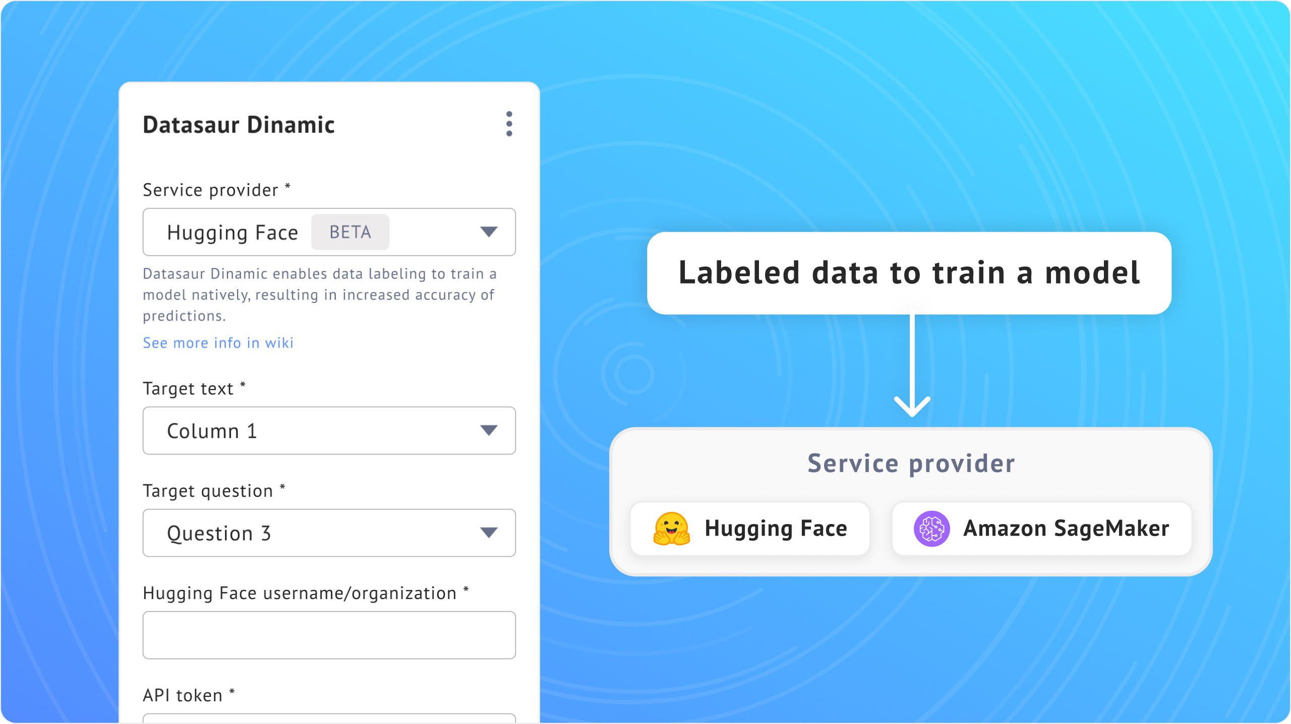**Datasaur Dinamic** is an ideal solution for users who prefer to obtain a trained model directly rather than labeled data. It is integrated with Amazon SageMaker and Hugging Face AutoTrain. It supports row-based tasks with Amazon SageMaker and Hugging Face AutoTrain, and token-based tasks exclusively with Hugging Face AutoTrain.