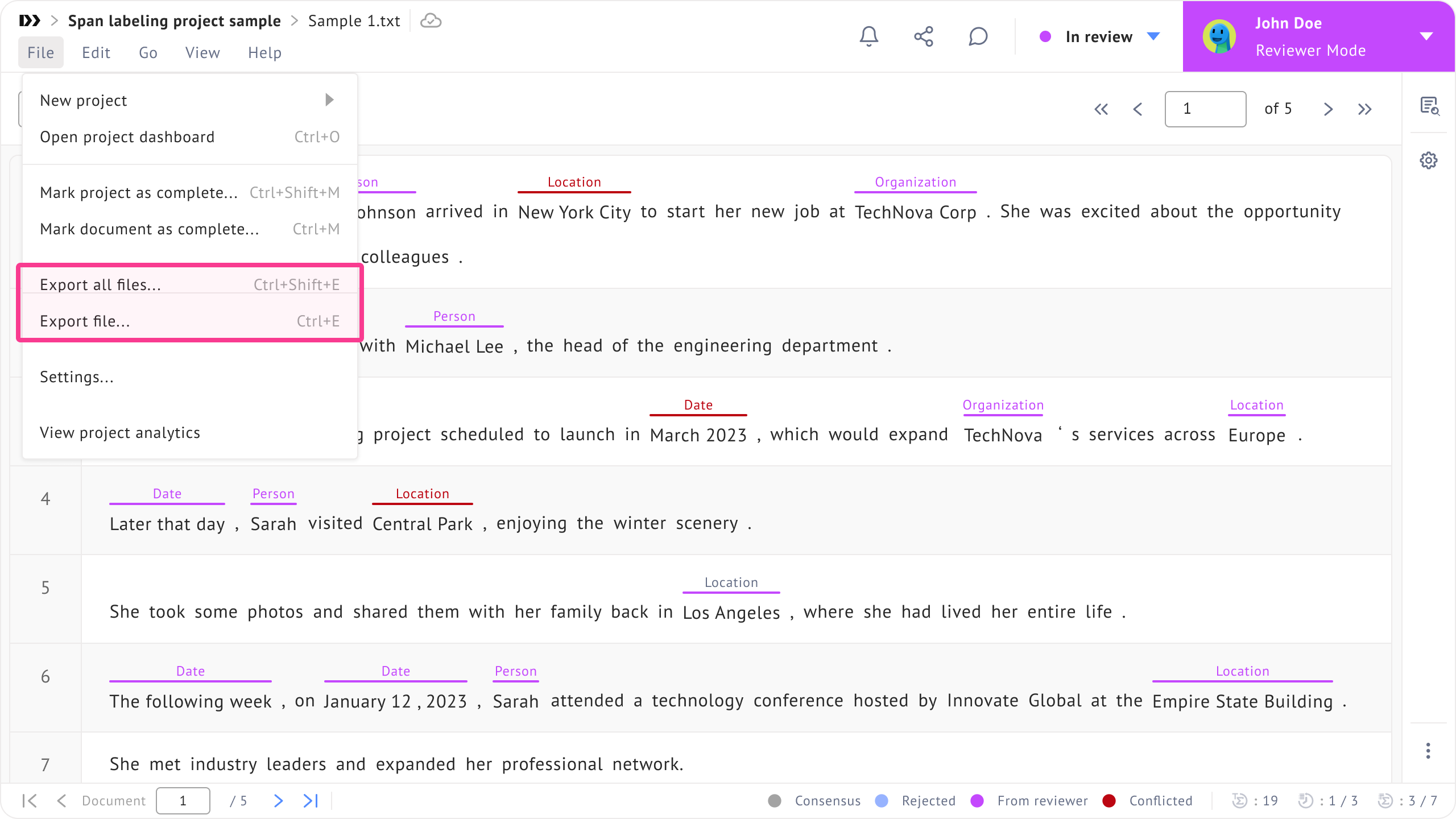 * REVIEW is a folder containing the final copy of all labels, including Datasaur auto-accepted labels and Reviewer applied labels.