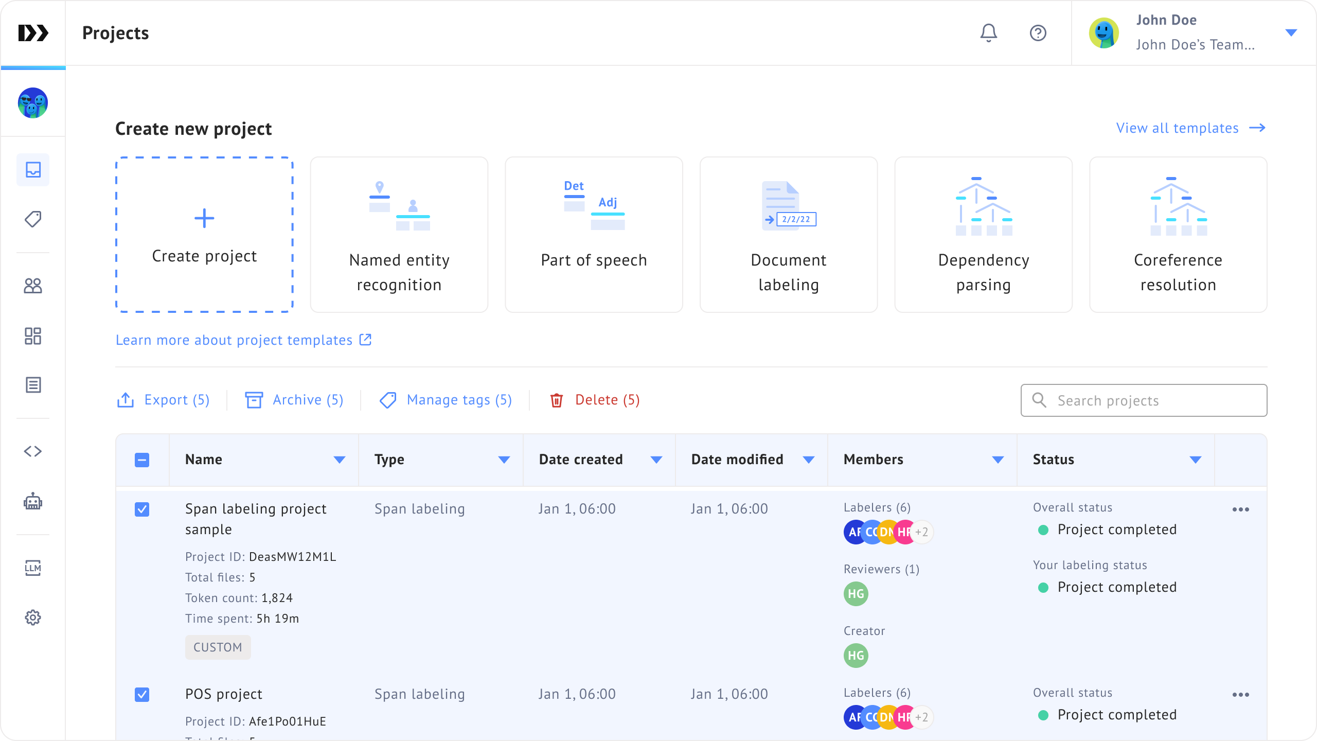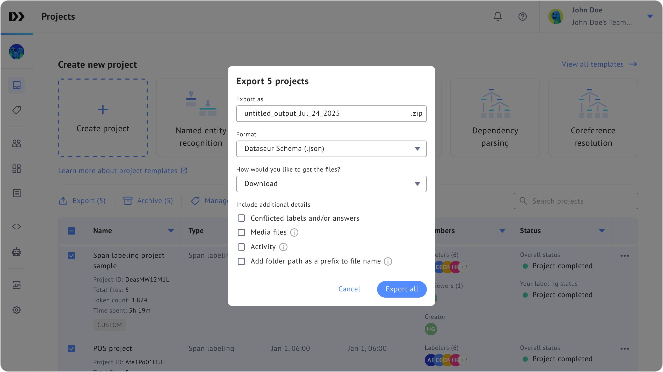 It is available for Span, Row, and Document Labeling projects in both Datasaur Schema and Comma-separated values format.