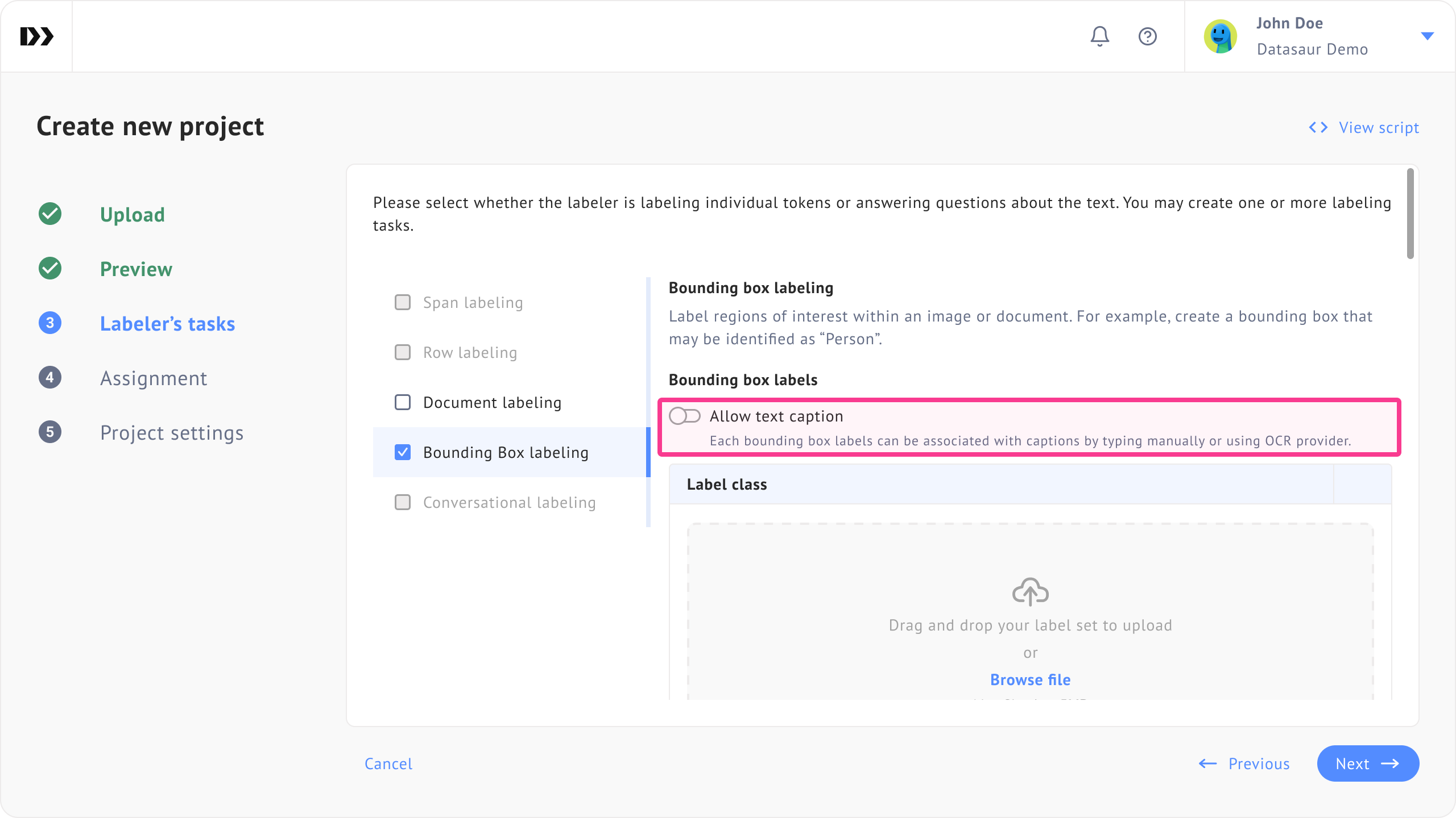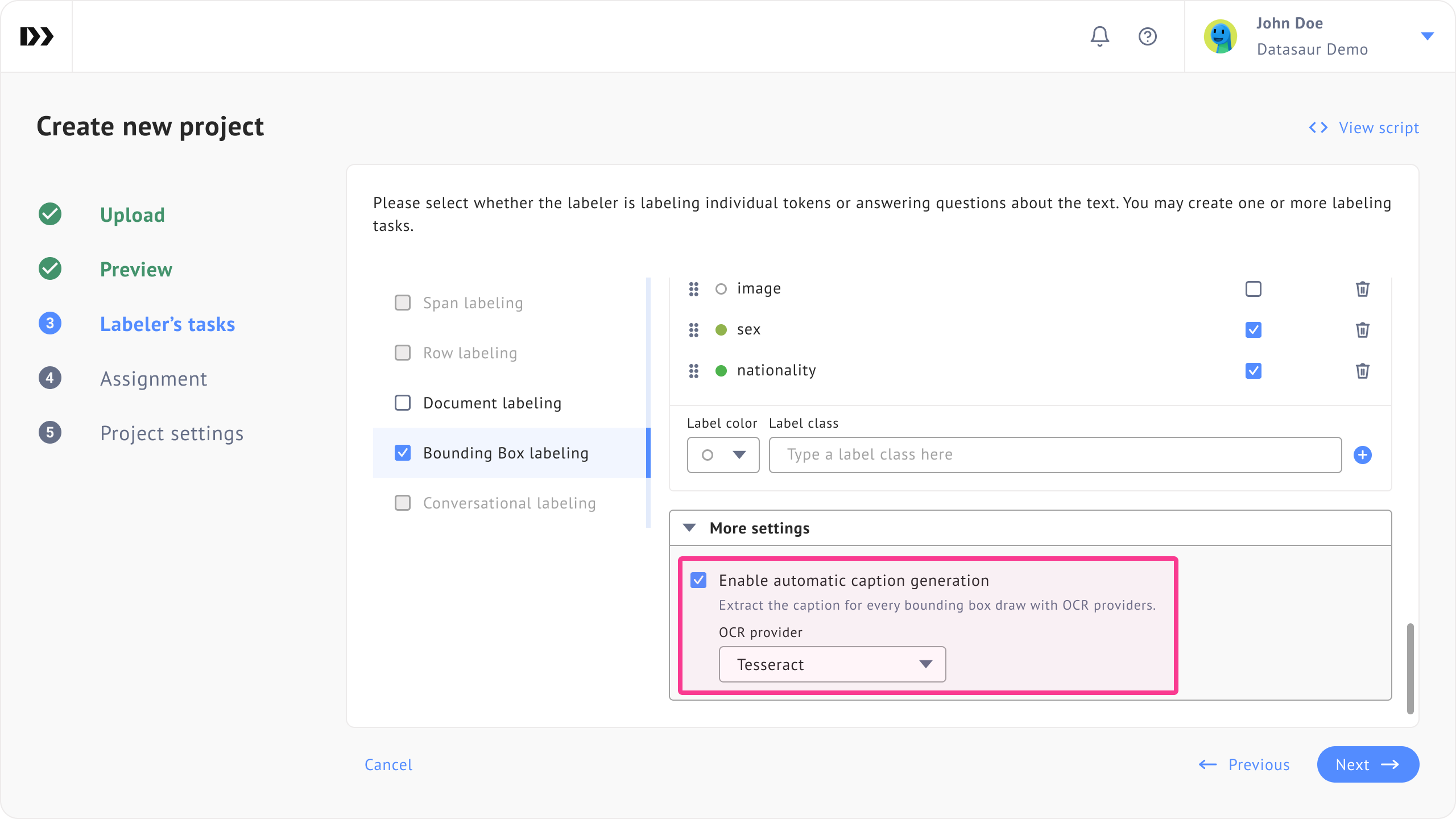 **For the Step 2. Preview** please make sure you select None for the Apply OCR Method under the preview settings. Afterward, we can move on to the next steps, under **Step 3. Labeler’s tasks**, you can add a label set by ticking the Bounding Box labeling checkbox. Here’s what the settings will do for your project: