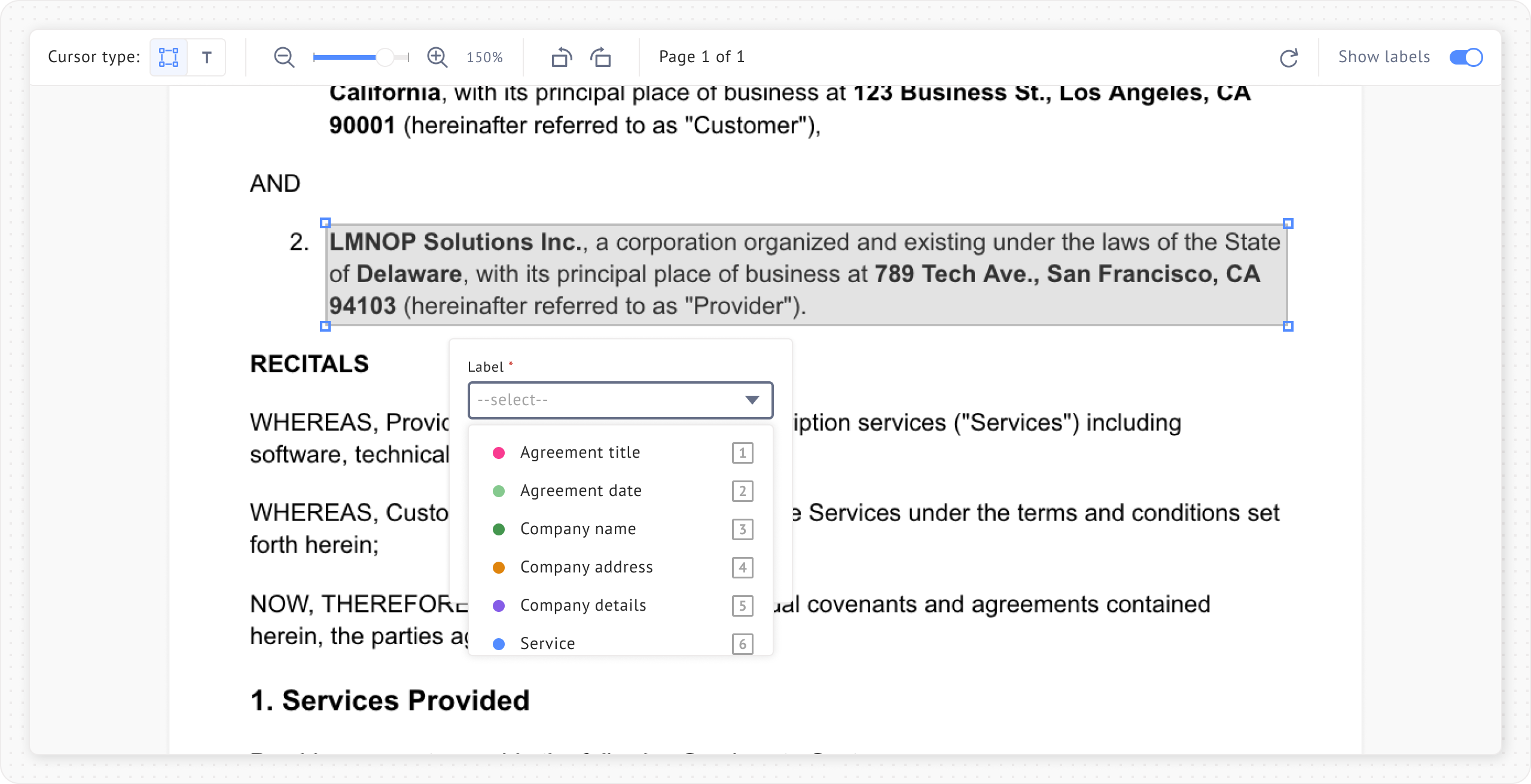 The Text Selection mode is another method to create bounding boxes by selecting text directly within documents. This approach eliminates the need to manually draw rectangles, making the labeling process quicker — especially when working with text-based documents.
