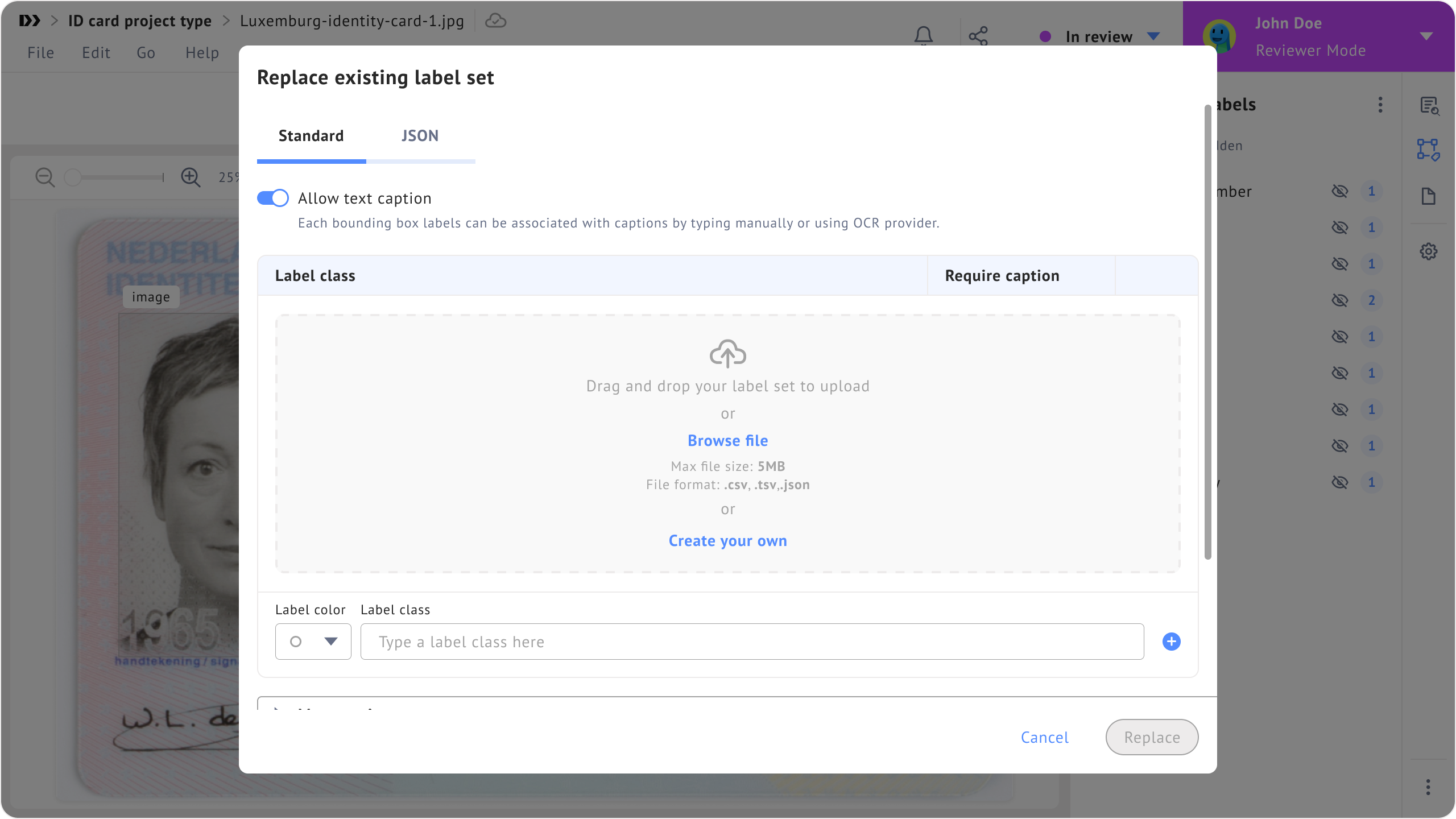 If you need to replace the current label set, you can do so by clicking the three dots and choosing 'Replace existing label set'. This will provide a drag-and-drop area where you can upload your desired label set.