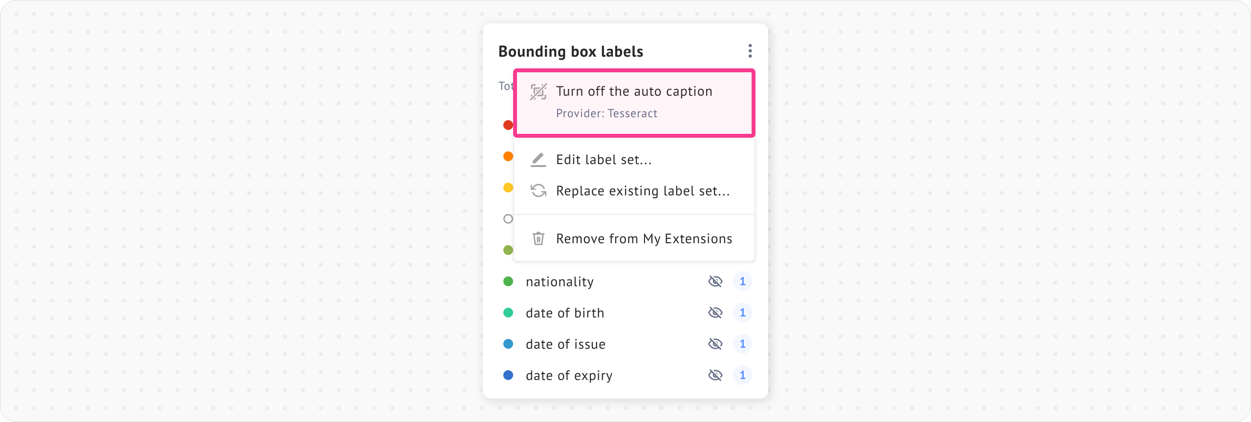 <figure><img src="https://448889121-files.gitbook.io/~/files/v0/b/gitbook-x-prod.appspot.com/o/spaces%2F-MbjY0HseEqu7LtYAt4d%2Fuploads%2Fgit-blob-29501f573afb433e8b720945c31ed363770be09c%2FExtension%20%20-%20bounding%20box%20labels%20-%20empty%20-%20more%20menu.png?alt=media" alt=""><figcaption></figcaption></figure>