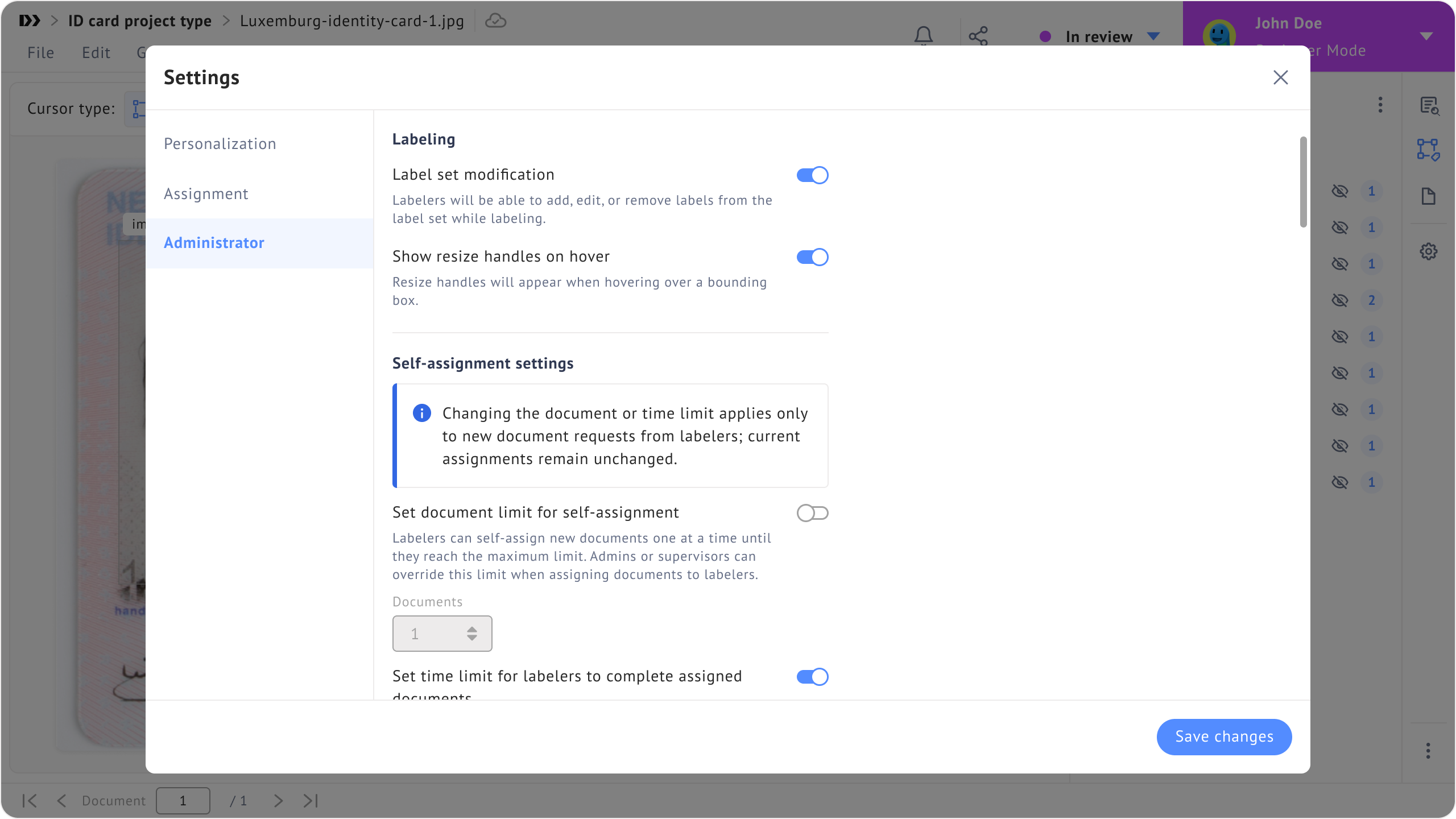 By default, both Reviewers and Labelers have access to these capabilities. However, if you prefer to restrict this capability for your Labelers, you can adjust it in **File > Settings > Administrator** and toggle off the option.