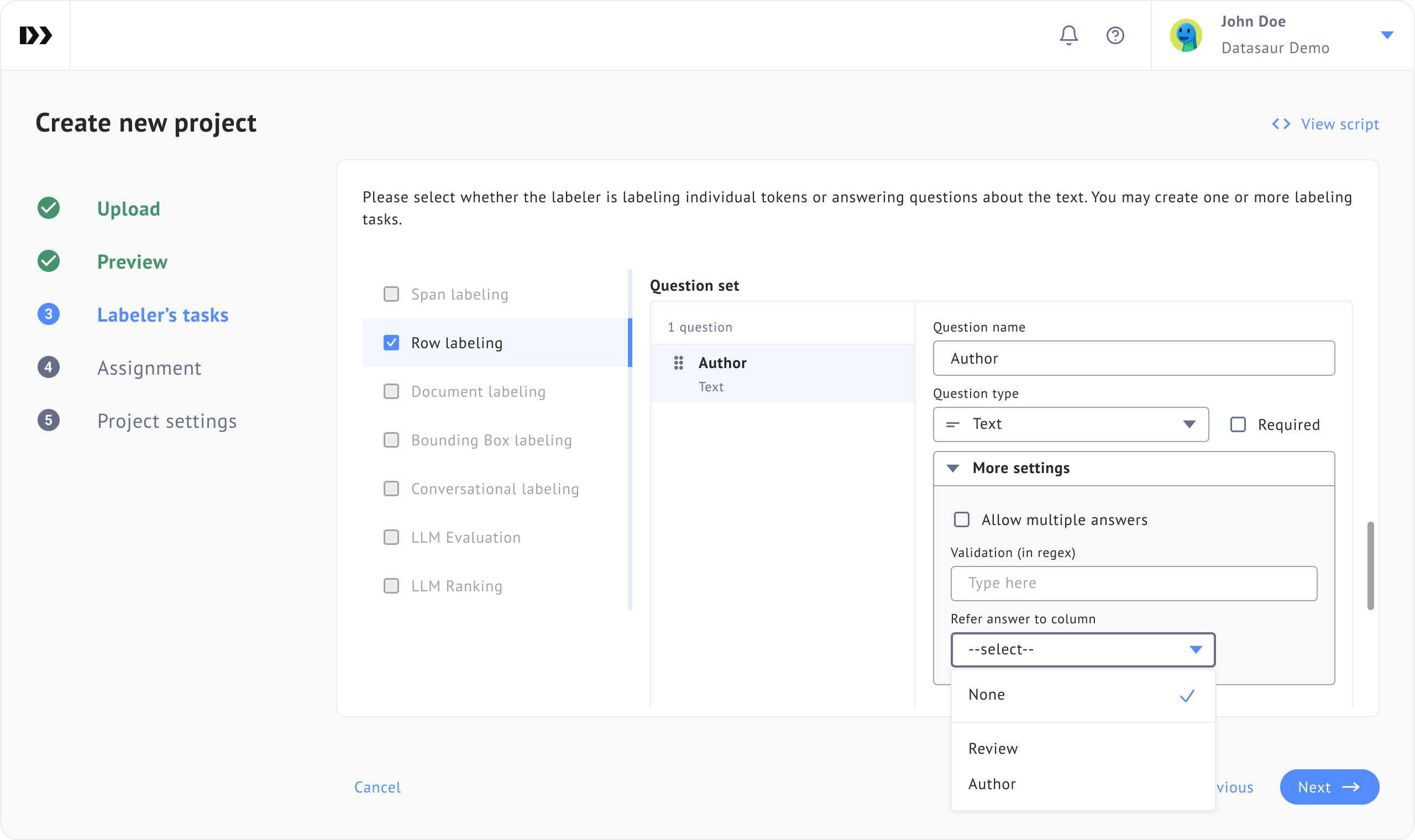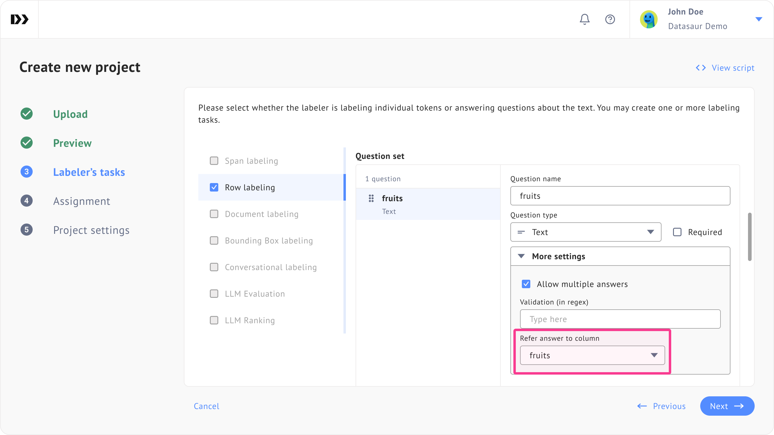 You can achieve this by configuring ‘**Refer answer to table column’** for each question and mapping it to a specific column header in your dataset. Once set, the system automatically creates pre-labeled answers based on the values in that column.