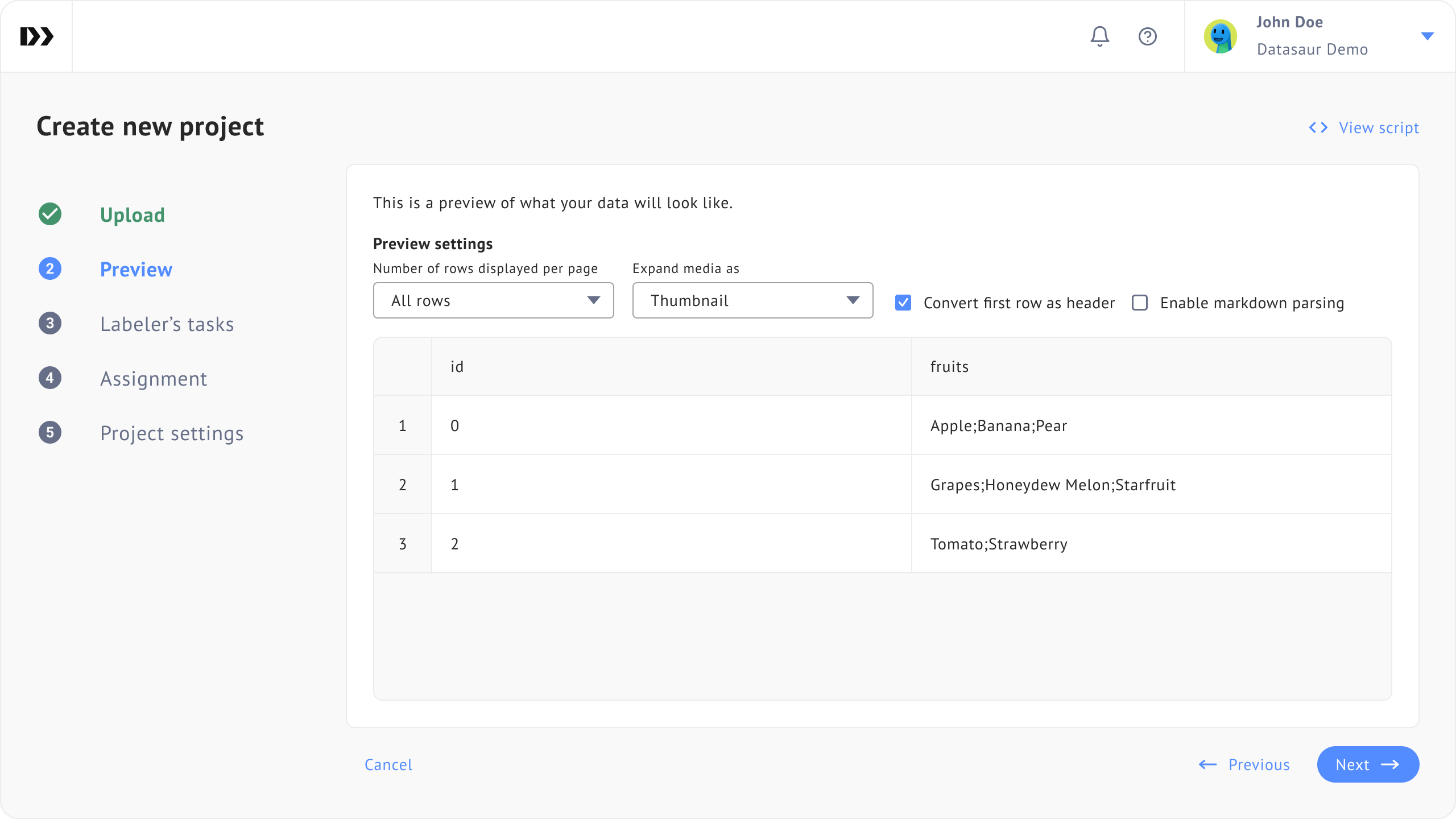 2. In the Preview step of the Project Creation Wizard, make sure to enable **Convert first row as header**.