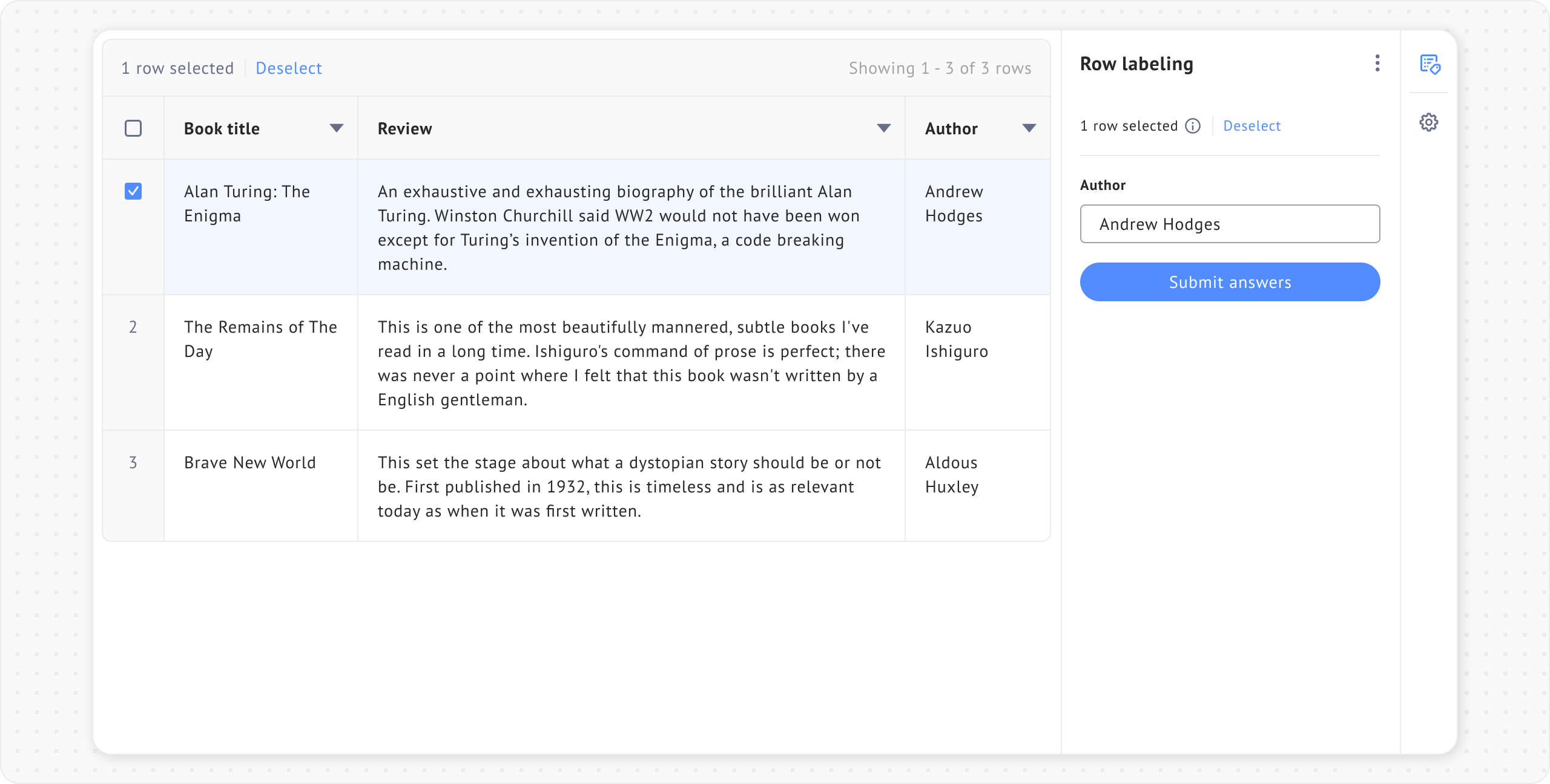 <figure><img src="https://448889121-files.gitbook.io/~/files/v0/b/gitbook-x-prod.appspot.com/o/spaces%2F-MbjY0HseEqu7LtYAt4d%2Fuploads%2Fgit-blob-8db75f1b5e72b7fb06d6d58c87a45a612f12d183%2FProject%20-%20row%20labeling%20-%201%20row%20selected%20-%20row%20labeling%20extension%20-%20refer%20answer%20to%20table%20column.png?alt=media" alt=""><figcaption></figcaption></figure>