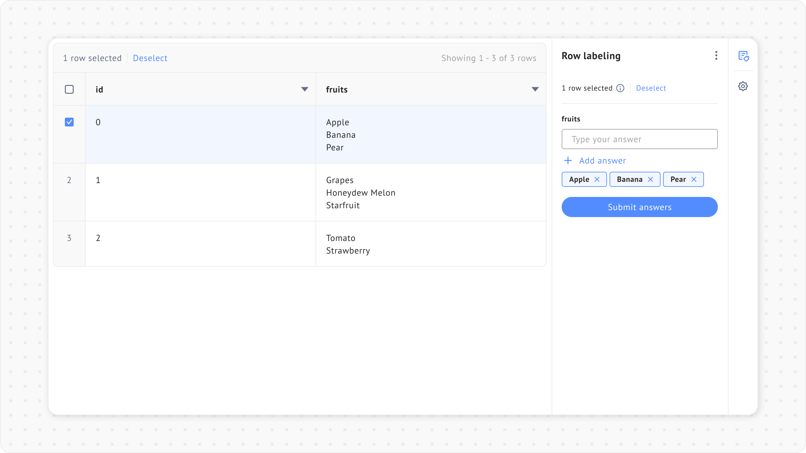 * **Result:** The system creates three pre-labeled answers: **Apple**, **Banana**, and **Pear**.