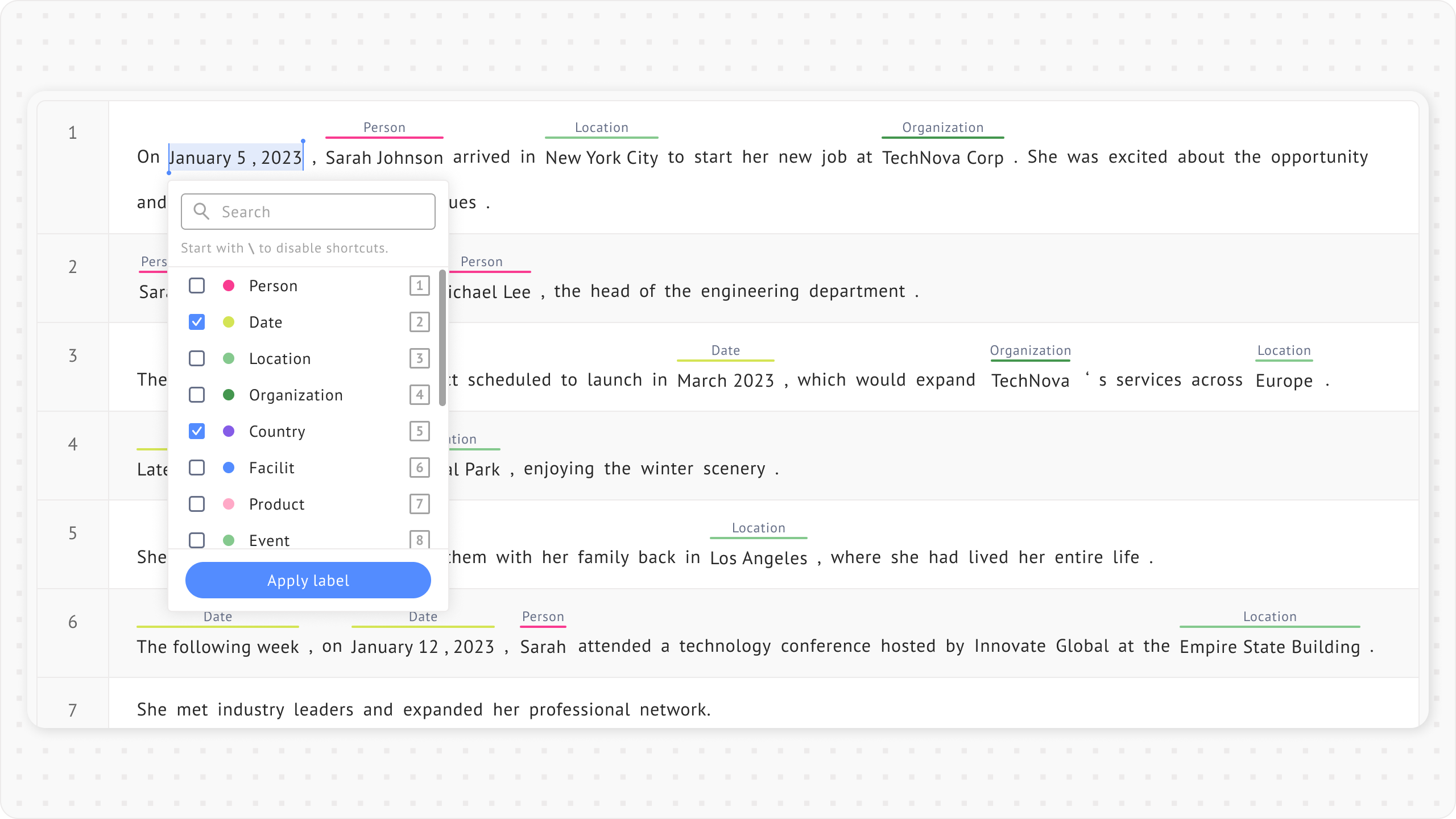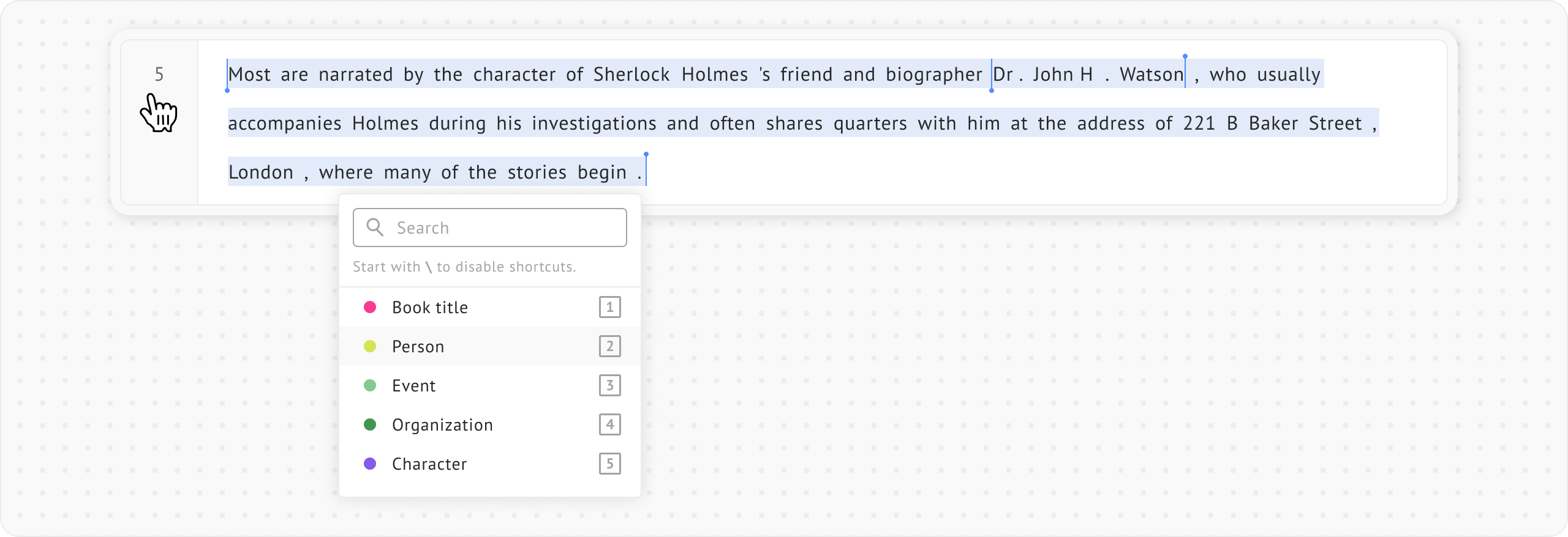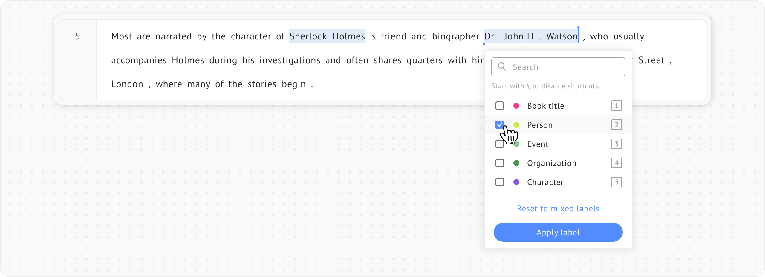 In the following documentation we will guide you on how to use hotkeys to apply labels and how to apply multiple labels to the same token span.