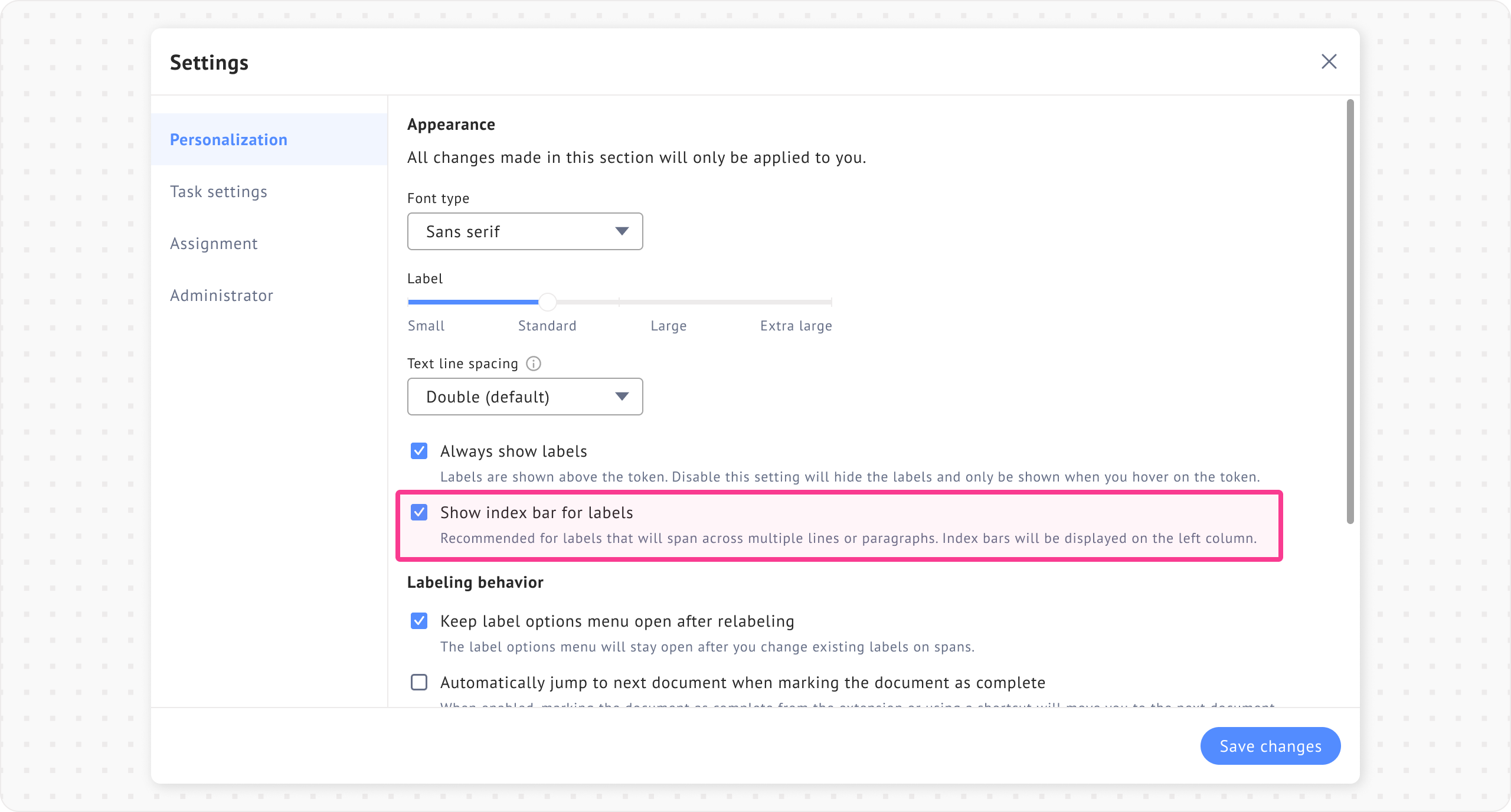 <figure><img src="https://448889121-files.gitbook.io/~/files/v0/b/gitbook-x-prod.appspot.com/o/spaces%2F-MbjY0HseEqu7LtYAt4d%2Fuploads%2Fgit-blob-31e4384a11775466e695b3cfdaff786542b0094a%2FProject%20settings%20-%20span%20labeling%20-%20personalization%20-%20Show%20index%20bar.png?alt=media" alt=""><figcaption></figcaption></figure>
